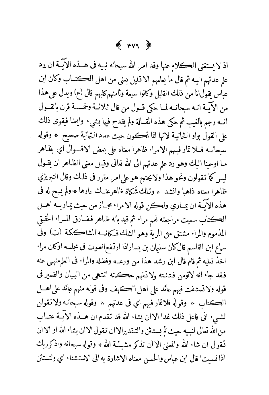 إذ لا يستغنى الكلام عنها قد أمر الله سبحانه نبيه في هذه الآية أن يرد علم عدتهم إليه ثم قال ما يعلمهم إلا قليل يعني من أهل الكتاب وكان ابن عباس يقول أنا من ذلك القليل وكانوا سبعة وثامنهم كلبهم قال ع ويدل على هذا من الآية أنه سبحانه لما حكى قول من قال ثلاثة وخمسة قرن بالقول أنه رجم بالغيب ثم حكى هذه المقالة ولم يقدح فيها بشيء وأيضا فيقوى ذلك على القول بواو الثمانية لأنها إنما تكون حيث عدد الثمانية صحيح