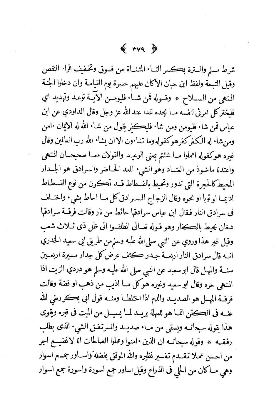 وقوله فمن شاء ليؤمن الآية توعد وتهديد أي فليختر كل أمرئى لنفسه ما يجده غدا عند الله عز و جل وقال الداودي عن ابن عباس فمن شاء فليؤمن ومن شاء فليكفر يقول من شاء الله له الإيمان آمن ومن شاء له الكفر كفر هو كقوله وما تشاءون إلا أن يشاء الله رب العالمين وقال غيره هو كقوله أعملوا ما شئتم بمعنى الوعيد والقولان معا صحيحان انتهى واعتدنا مأخوذ من العتاد وهو الشيء المعد الحاضر والسرادق هو الجدار المحيط كالحجرة التي تدور وتحيط بالفسطاط قد تكون من نوع الفسطاط اديما أ ثوبا أو نحوه وقال الزجاج السرادق كل ما أحاط بشيء واختلف في سرادق النار فقال ابن عباس سرادقها حائط من نار وقالت فرقة سرادقها دخان يحيط بالكفار وهو قوله تعالى انطلقوا إلى ظل ذي ثلاث شعب وقيل غير هذا وروي عن النبي صلى الله عليه و سلم من طريق أبي سعيد الخدري أنه قال سرادق النار أربعة جدر كثف عرض كل جدار مسيرة أربعين سنة والمهل قال أبو سعيد عن النبي صلى الله عليه و سلم هو دردي الزيت إذا انتهى حره وقال أبو سعيد وغيره هو كل ما أذيب من ذهب أو فضة وقالت فرقة المهل هو الصديد والدم إذا اختلطا ومنه قول أبي بكر رضي الله عنه في الكفن إنما هو للمهلة يريد لما يسيل من الميت في قبره ويقوى هذا بقوله سبحانه ويسقى من ماء صديد والمرتفق الشيء الذي بطلب رفقه