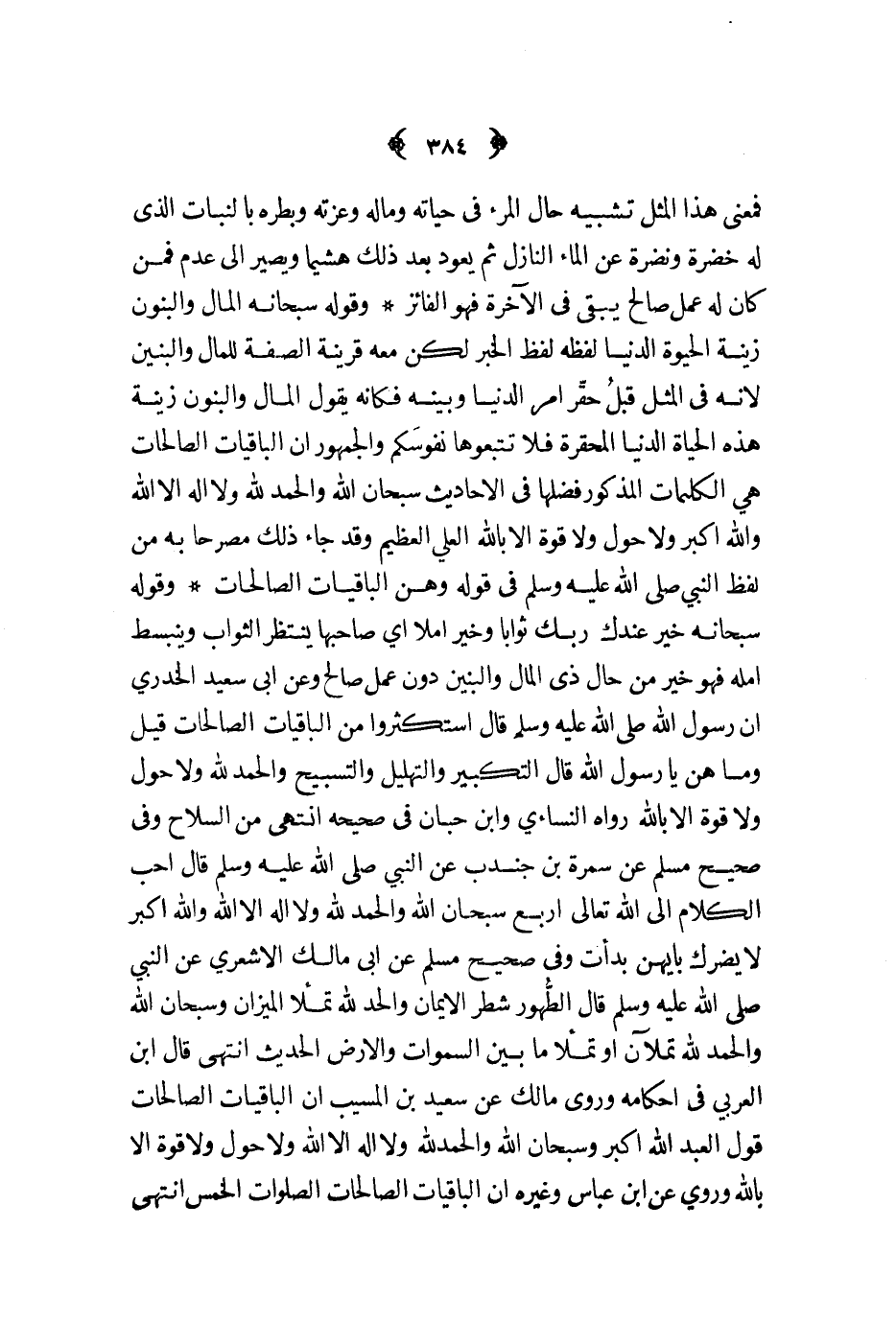 وقوله سبحانه المال والبنون زينة الحيوة الدنيا لفظه لفظ الخبر لكن معه قرينة الصفة للمال والبنين لأنه في المثل قبل حقر أمر الدنيا وبينه فكأنه يقول المال والبنون زينة هذه الحياة الدنيا المحقرة فلا تبعوها نفوسكم والجمهور أن الباقيات الصالحات هي الكلمات المذكور فضلها في الأحاديث سبحان الله والحمد لله ولا إله إلا الله والله أكبر ولا حول ولا قوة إلا بالله العلي العظيم وقد جاء ذلك مصرحا به من لفظ النبي صلى الله عليه و سلم في قوله وهن الباقيات الصالحات