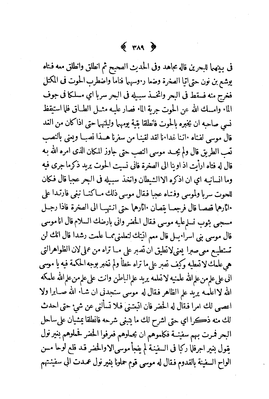 في بينهما للبحرين قاله مجاهد وفي الحديث الصحيح ثم انطلق وانطلق معه فتاه يوشع بن نون حتى أتيا الصخرة وضعا رؤوسهما فناما واضطرب الحوت في المكتل فخرج منه فسقط في البحر واتخذ سبيله في البحر سربا أي مسلكا في جوف الماء وأمسك الله عن الحوت جرية الماء فصار عليه مثل الطاق فلما استيقظ نسي صاحبه أن يخبره بالحوت فانطلقا بقية يومهما وليلتهما حتى إذا كان من الغد قال موسى لفتاه ءاتنا غداءنا لقد لقينا من سفرنا هذا نصبا ويعني بالنصب تعب الطريق قال ولم يجد موسى النصب حتى جاوز المكان الذي أمره الله به قال له فتاه ارأيت إذ أوينا إلى الصخرة فإني نسيت الحوت يريد ذكر ما جرى فيه وما انسانيه أي أن أذكره إلا الشيطان اتخذ سبيله في البحر عجبا قال فكان للحوت سربا ولموسى وفتاه عجبا فقال موسى ذلك ما كنا نبغي فارتدا على آثارهما قصصا قال فرجعا يقصان آثارهما حتى انتهيا إلى الصخرة فإذا رجل مسجي بثوب فسلم عليه موسى فقال الخضر وإني بأرضك السلام قال أنا موسى قال موسى بني إسرائيل قال معم آتيتك لتعلمني مما علمت رشدا قال إنك لن تستطيع معي صبرا يعني لا تطيق أن تصبر على ما تراه من عملي لأن الظواهر التي هي علمك لا تعطيه وكيف تصبر على ما تراه خطأ ولم تخبر بوجه الحكمة فيه يا موسى إني على علم من علم الله علمنيه لا تعلمه يريد علم الباطن وأنت على علم من علم الله علمكه الله لا أعلمه يريد علم الظاهر فقال له موسى ستجدني إن شاء الله صابرا ولا أعصي لك أمرا فقال له الخضر فإن اتبعتني فلا تسألني عن شيء حتى أحدث لك منه ذكرا أي حتى اشرح لك ما ينبغي شرحه فانطلقا يمشيان على ساحل البحر فمرت بهم سفينة فكلموهم أن يحملوهم فعرفوا الخضر فحملوهم بغي نول يقول بغير أجر فلما ركبا في السفينة لم يفجأ موسى إلا والخضر قد قلع لوحا من الواح السفينة بالقدوم فقال له موسى قوم حملونا بغير نول عمدت إلى سفينتهم