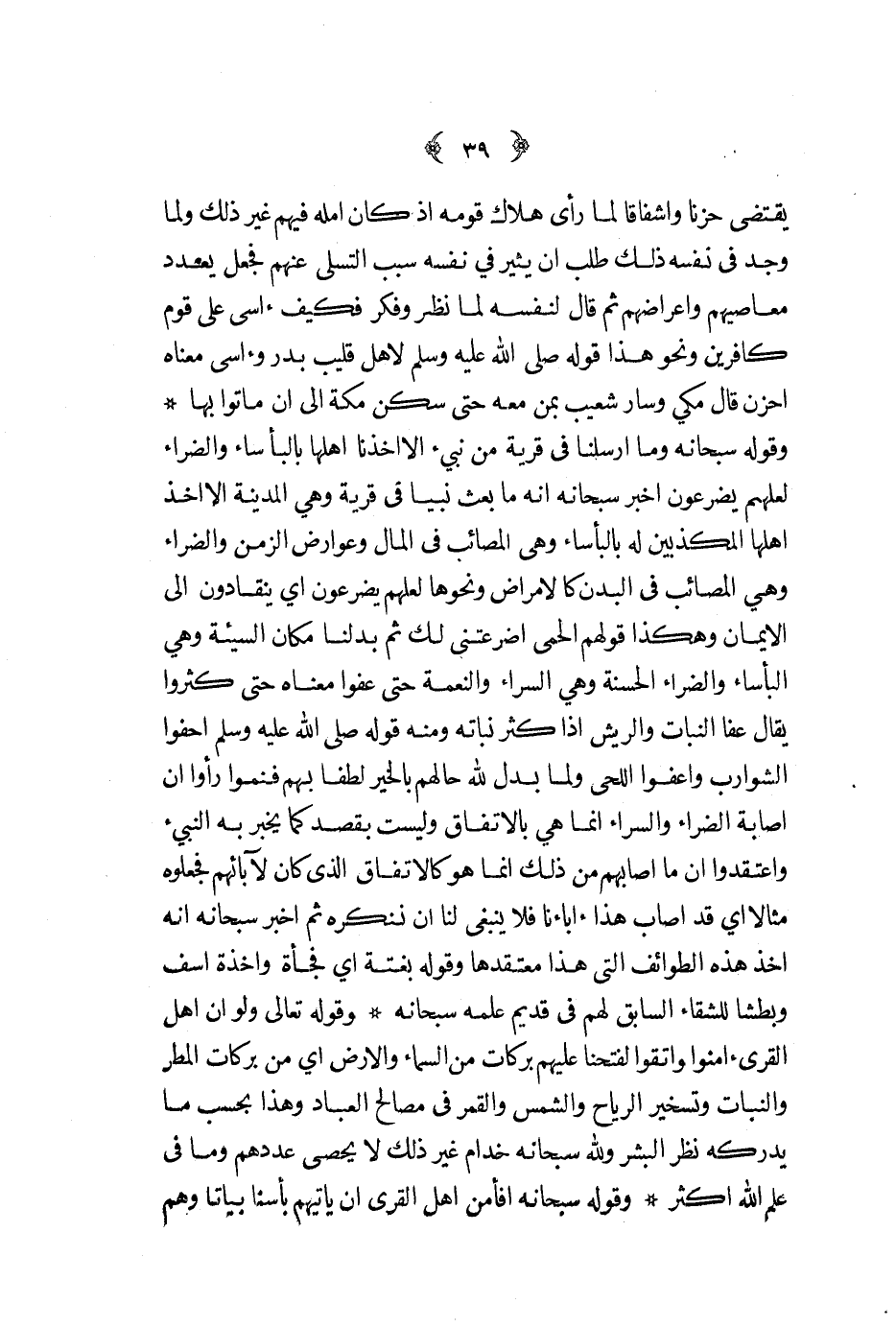 وقوله سبحانه وما أرسلنا في قرية من بني إلا أخذنا أهلها بالبأساء والضراء لعلهم يضرعون أخبر سبحانه أنه ما بعث نبيا في قرية وهي المدينة إلا أخذ أهلها المكذبين له بالبأساء وهي المصائب في المال وعوارض الزمن والضراء وهي المصائب في البدن كالأمراض ونحوها لعلهم يضرعون أي ينقادون إلى الإيمان وهكذا قولهم الحمى أضرعتني لك ثم بدلنا مكان السيئة وهي البأساء والضراء الحسنة وهي البأساء والضراء الحسنة وهي السراء والنعمة حتى عفوا معناه حتى كثروا يقال عفا النبات والريش إذا كثر نباته ومنه قوله صلى الله عليه و سلم احفوا الشوارب واعفوا اللحى ولما بدل الله حالهم بالخير لطفا بهم فنموا رأوا أن إصابة الضراء والسراء إنما هي بالاتفاق وليست بقصد كما يخبر به النبيء واعتقدوا أن ما أصابهم من ذلك إنما هو كالاتفاق الذي كان لآبائهم فجعلوه مثالا أي قد أصاب هذا آبائنا فلا ينبغي لنا أن ننكره ثم أخبر سبحانه أنه أخذ هذه الطوائف اللتي هذا معتقدها وقوله بغتة أي فجأة وأخذة أسف وبطشا للشقاء السابق لهم في قديم علمه سبحانه