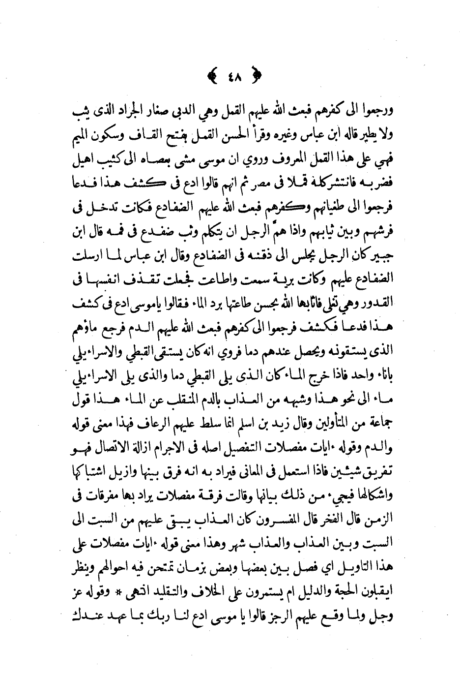 ورجعوا إلى كفرهم فبعث الله عليهم القمل وهي الدبى صغار الجراد الذي يثب ولا يطير قاله ابن عباس وغيره وقرأ الحسن القمل بفتح القاف وسكون الميم فهي على هذا القمل المعروف وروي أن موسى مشى بعصاه إلى كثيب أهيل فضربه فانتشر كله قملا في مصر ثم أنهم قالوا أدع في كشف هذا فدعا فرجعوا إلى طغيانهم وكفرهم فبعث الله عليهم الضفادع فكانت تدخل في فرشهم وبين ثيابهم وإذا هم الرجل أن يتكلم وثب ضفدع في فمه قال ابن جبير كان الرجل يجلس إلى ذقنه في الضفادع وقال ابن عباس لما أرسلت الضفادع عليهم وكانت برية سمعت وأطاعت فجعلت تقذف أنفسها في القدور وهي تغلي فأثابها الله بحسن طاعتها برد الماء فقالوا يا موسى ادع في كشف هذا فدعا فكشف فرجعوا إلى كفرهم فبعث الله عليهم الدم فرجع ماؤهم الذي يستقونه ويحصل عنده دما فروي أنه كان يستقى القبطي والإسرائيلي باناء واحد فإذا خرج الماء كان الذي يلي القبطي دما والذي يلي الإسراءيلي ماء إلى نحو هذا وشبهه من العذاب بالدم المنقلب عن الماء هذا قول جماعة من المتأولين وقال زيد بن أسلم إنما سلط عليهم الرعاف فهذا معنى قوله والدم وقوله آيات مفصلات التفصيل اصله في الإجرام إزالة الاتصال فهو تفريق شيئين فإذا استعمل في المعاني فيراد به أنه فرق بينها وأزيل اشتباكها وإشكالها فيجيء من ذلك بيانها وقالت فرقة مفصلات يراد بها مفرقات في الزمن قال الفخر قال المفسرون كان العذاب يبقى عليهم من السبت إلى السبت وبين العذاب والعذاب شهر وهذا معنى قوله آيات مفصلات على هذا التأويل أي فصل بين بعضها وبعض بزمان تمتحن فيه أحوالهم وينظر ايقبلون الحجة والدليل أم يستمرون على الخلاف والتقليد انتهى
