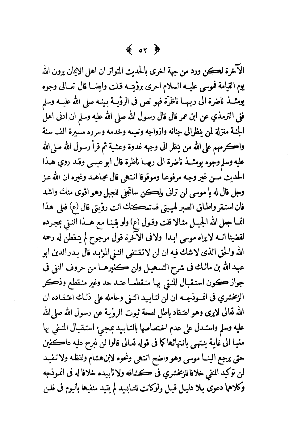 الآخرة لكن ورد من جهة أخرى بالحديث المتواتر أن أهل الإيمان يرون الله يوم القيامة فموسى عليه السلام أحرى برؤيته قلت وأيضا قال تعالى وجوه يومئذ ناضرة إلى ربها ناظرة فهو نص في الرؤية بينه صلى الله عليه و سلم ففي الترمذي عن ابن عمر قال قال رسول الله صلى الله عليه و سلم أن أدنى أهل الجنة منزلة لمن ينظر إلى جنانه وازواجه ونعيمه وخدمه وسرره مسيرة ألف سنة وأكرمهم على الله من ينظر إلى وجهه غدوة وعشية ثم قرأ رسول الله صلى الله عليه و سلم وجوه يومئذ ناضرة إلى ربها ناظرة قال أبو عيسى وقد روي هذا الحديث من غير وجه مرفوعا وموقوفا انتهى قال مجاهد وغيره أن الله عز و جل قال له يا موسى لن تراني ولكن سأتجلى للجبل وهو أقوى منك وأشد فإن استقر وأطاق الصبر لهيبتي فستمكنك أنت رؤيتي قال ع فعلى هذا إنما جعل الله الجبل مثالا قلت وقول ع ولو بقينا مع هذا النفي بمجرده لقضينا أنه لا يراه موسى أبدا ولا في الآخرة قول مرجوح لم يتفطن له رحمه الله والحق الذي لا شك فيه أن لن لا تقتضي النفي المؤبد قال بدر الدين أبو عبد الله بن مالك في شرح التسهيل ولن كغيرها من حروف النفي في جواز كون استقبال المنفي بها منقطعا عند حد وغير منقطع وذكر الزمخشري في أنموذجه أن لن لتأبيد النفي وحامله على ذلك اعتقاده أن الله تعالى لا يرى وهو اعتقاد باطل لصحة ثبوت الرؤية عن رسول الله صلى الله عليه و سلم واستدل على عدم اختصاصها بالتأبيد بمجيء استقبال المنفي بها مغيا إلى غاية ينتهي بانتهائها كما في قوله تعالى قالوا لن نبرح عليه عاكفين حتى يرجع إلينا موسى وهو واضح انتهى ونحوه لأبن هشام ولفظه ولا تفيد لن توكيد المنفي خلافا للزمخشري في كشافه ولا تأبيده خلافا له في أنموذجه وكلاهما دعوى بلا دليل قيل ولو كانت للتأبيد لم يقيد منفيها باليوم في فلن