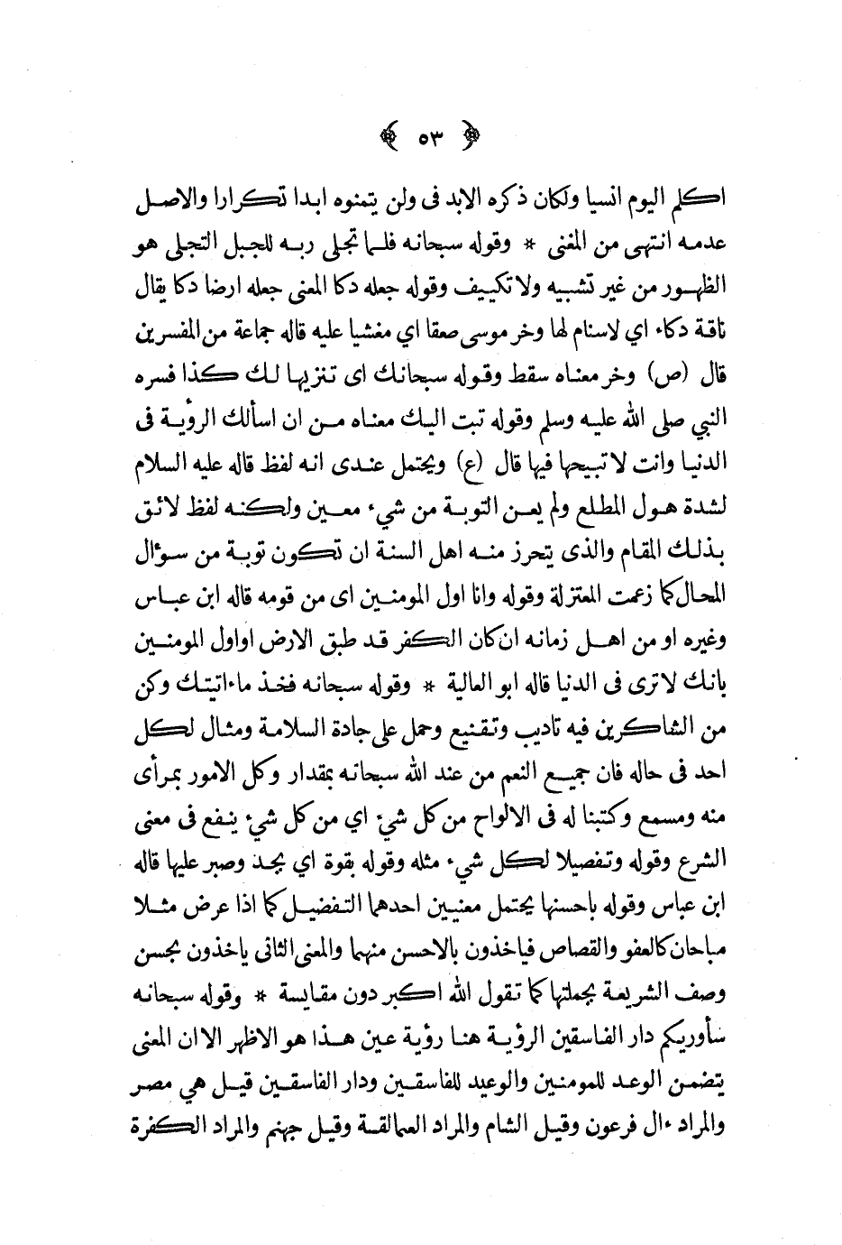 وقوله سبحانه فلما تجلى ربه للجبل التجلي هو الظهور من غير تشبيه ولا تكليف وقوله جعله دكا المعنى جعله أرضا دكا يقال ناقة دكاء أي لا سنام لها وخر موسى صعقا أي مغشيا عليه قاله جماعة من المفسرين قال ص وخر معناه سقط وقوله سبحانك أن تنزيها لك كذا فسره النبي صلى الله عليه و سلم وقوله تبت إليك معناه من أن أسألك الرؤية في الدنيا وأنت لا تبيحها فيها قال ع ويحتمل عندي أنه لفظ قاله عليه السلام لشدة هول المطلع ولم يعن التوبة من شيء معين ولكنه لفظ لائق بذلك المقام والذي يتحرز منه أهل السنة أن تكون توبة من سؤال المحال كما زعمت المعتزلة وقوله وأنا أول المؤمنين أي من قومه قاله ابن عباس وغيره أو من أهل زمانه إن كان الكفر قد طبق الأرض أو أول المؤمنين بأنك لا ترى في الدنيا قاله أبو العالية 3وقوله سبحانه فخذ ما أتيتك وكن من الشاكرين فيه تأديب وتقنيع وحمل على جادة السلامة ومثال لكل أحد في حاله فإن جميع النعم من عند الله سبحانه بمقدار وكل الأمور بمرأى منه ومسمع وكتبنا له في الألواح من كل شيء أي من كل شيء ينفع في معنى الشرع وقوله وتفصيلا لكل شيء مثله وقوله بقوة أي بجد وصبر عليها قاله ابن عباس وقوله بأحسنها يحتمل معنيين أحدهما التفضيل كما إذا عرض مثلا مباحان كالعفو والقصاص فيأخذون بالأحسن منهما والمعنى الثاني يأخذون بحسن وصف الشريعة بجملتها كما تقول الله أكبر دون مقايسة