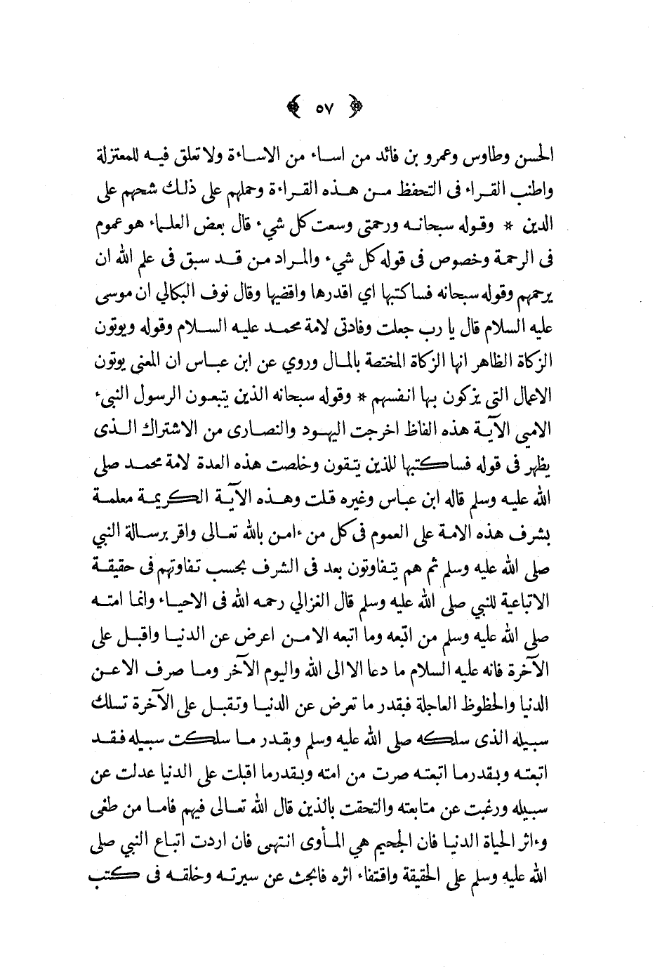 وقوله سبحانه الذين يتبعون الرسول النبي الأمي الآية هذه ألفاظ أخرجت اليهود والنصارى من الاشتراك الذي يظهر في قوله فسأكتبها للذين يتقون وخلصت هذه العدة لأمة محمد صلى الله عليه و سلم قاله ابن عباس وغيره قلت وهذه الآية الكريمة معلمة بشرف هذه الأمة على العموم في كل من آمن بالله تعالى وأقر برسالة النبي صلى الله عليه و سلم ثم هم يتفاوتون بعد في الشرف بحسب تفاوتهم في حقيقة الاتباعية للنبي صلى الله عليه و سلم قال الغزالي رحمة الله في الأحياء وإنما أمته صلى الله عليه و سلم من اتبعه وما أتبعه إلا من أعرض عن الدنيا وأقبل على الآخرة فإنه عليه السلام ما دعا إلا إلى الله واليوم الآخر وما صرف إلا عن الدنيا والحظوظ العاجلة فبقدر ما تعرض عن الدنيا وتقبل على الآخرة تسلك سبيله الذي سلكه صلى الله عليه و سلم وبقدر ما سلكت سبيله فقد اتبعته وبقدر ما اتبعته صرت من أمته وبقدر ما أقبلت على الدنيا عدلت عن سبيله ورغبت عن متابعته والتحقت بالذين قال الله تعالى فيهم فأما من طغى وآثر الحياة الدنيا فإن الجحيم هي المأوى انتهى فإن أردت إتباع النبي صلى الله عليه و سلم على الحقيقة واقتفاء أثره فأبحث عن سيرته وخلقه في كتب