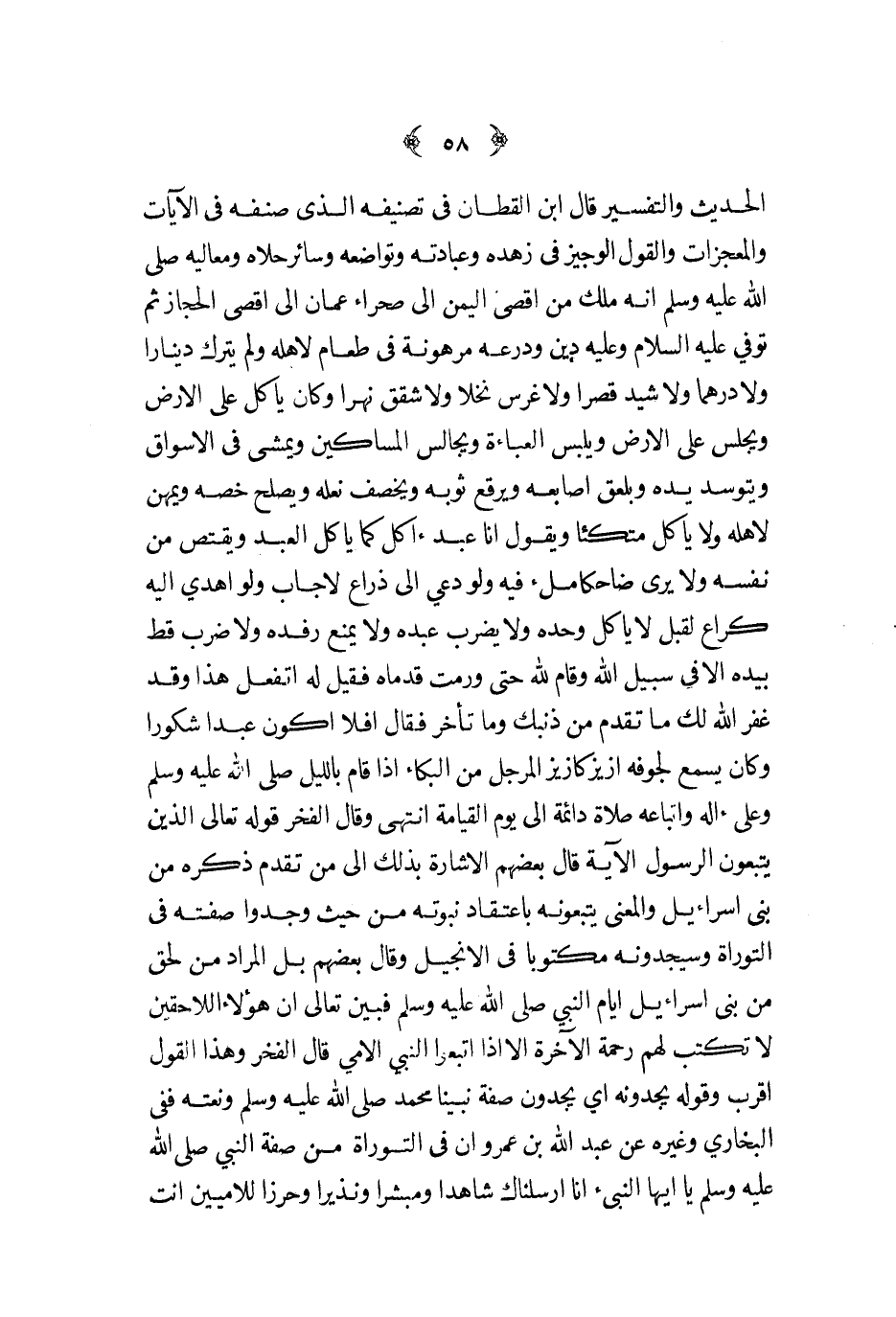 الحديث والتفسير قال ابن القطان في تصنيفه الذي صنفه في الآيات والمعجزات والقول الوجيز في زهده وعبادته وتواضعه وسائر حلاه ومعاليه صلى الله عليه و سلم أنه ملك من أقصى اليمن إلى صحراء عمان إلى أقصى الحجاز ثم توفي عليه السلام وعليه دين ودرعه مرهونة في طعام لأهله ولم يترك دينارا ولا درهما ولا شيد قصرا ولا غرس نخلا ولا شقق نهرا وكان يأكل على الأرض ويجلس على الأرض ويلبس العباءة ويجالس المساكين ويمشي في الأسواق ويتوسد يده ويلعق أصابعه ويرقع ثوبه ويخصف نعله ويصلح خصه ويمهن لأهله ولا يأكل متكئا ويقول أنا عبد آكل كما يأكل العبد ويقتص من نفسه ولا يرى ضاحكا ملء فيه ولو دعي إلى ذراع لأجاب ولو اهدي إليه كراع لقبل لا يأكل وحده ولا يضرب عبده ولا يمنع رفده ولا ضرب قط بيده إلا في سبيل الله وقام لله حتى ورمت قدماه فقيل له أتفعل هذا وقد غفر الله لك ما تقدم من ذنبك وما تأخر فقال أفلا أكون عبدا شكورا وكان يسمع لجوفه أزيز كأزيز المرجل من البكاء إذا قال بالليل صلى الله عليه و سلم على آله وأتباعه صلاة دائمة إلى يوم القيامة انتهى وقال الفخر قوله تعالى الذين يتبعون الرسول الآية قال بعضهم الإشارة بذلك إلى من تقدم ذكره من بني إسرائيل والمعنى يتبعونه باعتقاد نبوته من حيث وجدوا صفته في التوراة وسيجدونه مكتوبا في الإنجيل وقال بعضهم بل المراد من لحق من بني إسرائيل أيام النبي صلى الله عليه و سلم فبين تعالى أن هؤلاء اللاحقين لا تكتب لهم رحمة الآخرة إلا إذا أتبعوا النبي الأمي قال الفخر وهذا القول أقرب وقوله يجدونه أي يجدون صفة نبينا محمد صلى الله عليه و سلم ونعته ففي البخاري غيره عن عبد الله بن عمرو أن في التوراة من صفة النبي صلى الله عليه و سلم يا أيها النبي أرسلناك شاهدا ومبشرا ونذيرا وحرزا للأميين أنت