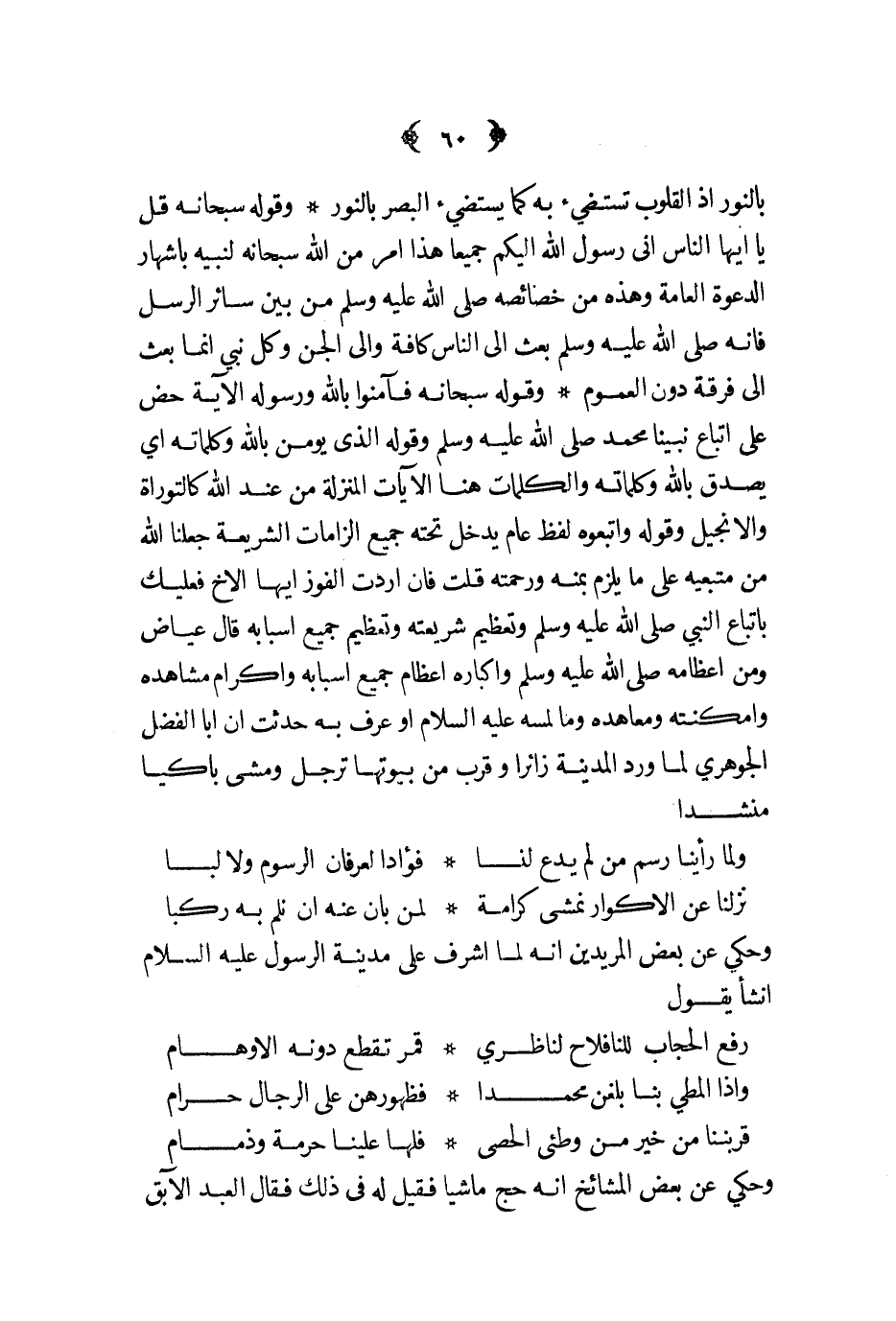 وحكي عن بعض المريدين أنه لما أشرف على مدينة الرسول عليه السلام أنشأ يقول ... رفع الحجاب للنا فلاح لناظري ... قمر تقطع دونه الأوهام ...