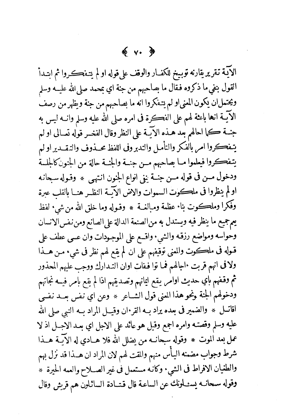 الآية تقرير يقارنه توبيخ للكفار والوقف على قوله أو لم يتفكروا ثم ابتدأ القول بنفي ما ذكروه فقال ما بصاحبهم من جنة أي بمحمد صلى الله عليه و سلم ويحتمل أن يكون المعنى أو لم يتفكروا أنه ما بصاحبهم من جنة ويظهر من رصف الآية أنها باعثة لهم على الفكرة في أمره صلى الله عليه و سلم وأنه ليس به جنة كما احالهم بعد هذه الآية على النظر وقال الفخر قوله تعالى أولم يتفكروا أمر بالفكر والتأمل والتدبر وفي اللفظ محذوف والتقدير أو لم يتفكروا فيعلموا ما بصاحبهم من جنة والجنة حالة من الجنون كالجلسة ودخول من في قوله من جنة ينفي أنواع الجنون انتهى