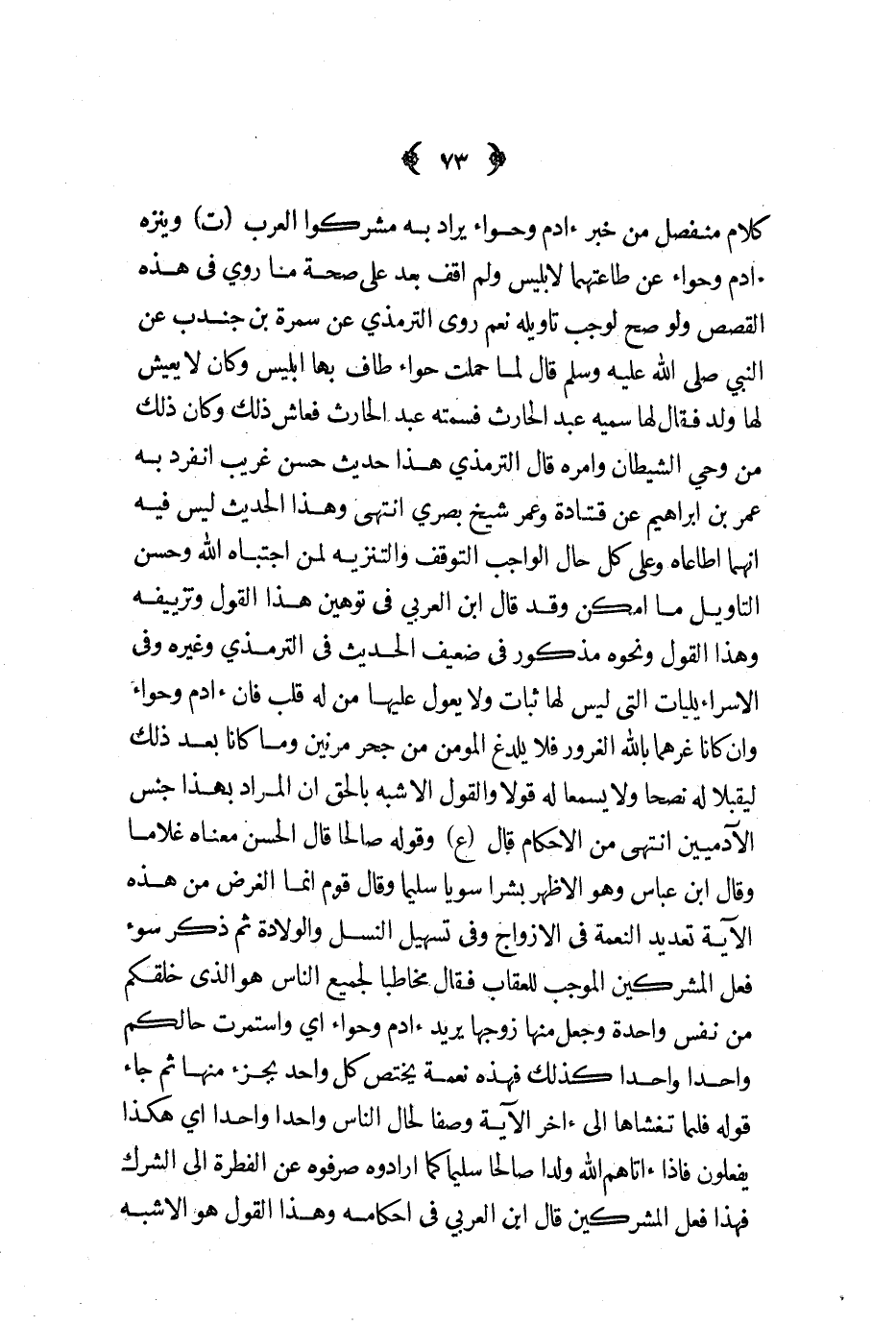كلام منفصل من خبر آدم وحواء يراد به مشركوا العرب ت وينزه آدم وحواء عن طاعتهما لإبليس ولم أقف بعد على صحة ما روي في هذه القصص ولو صح لوجب تأويله نعم روى الترمذي عن سمرة بن جندب عن النبي صلى الله عليه و سلم قال لما حملت حواء طاف بها إبليس وكان لا يعيش لها ولد فقال لها سميه عبد الحارث فسمته عبد الحارث فعاش ذلك وكان ذلك من وحي وأمره قال الترمذي هذا حديث حسن غريب انفرد به عمر بن إبراهيم عن قتادة وعمر شيخ بصري انتهى وهذا الحديث ليس فيه أنهما أطاعاه وعلى كل حال الواجب التوقف والتنزيه لمن اجتباه الله وحسن التأويل ما أمكن وقد قال ابن العربي في توهين هذا القول وتزييفه وهذا القول ونحوه مذكور في ضعيف الحديث في الترمذي وغيره وفي الإسرائيليات التي ليس لها ثابت ولا يعول عليها من له قلب فإن آدم وحواء وإن كانا غرهما بالله الغرور فلا يلدغ المؤمن من حجر مرتين وما كانا بعد ذلك ليقبلا له نصحا ولا يسمعا له قولا والقول الاشبه بالحق أن المراد بهذا جنس الآدميين انتهى من الأحكام قال ع وقوله صالحا قال الحسن معناه غلاما وقال ابن عباس وهو الأظهر بشرا سويا سليما وقال قوم إنما الغرض من هذه الآية تعديد النعمة في الأزواج وفي تسهيل النسل والولادة ثم ذكر سوء فعل المشركين الموجب للعقاب فقال مخاطبا لجميع الناس هو الذي خلقكم من نفس واحدة وجعل منها زوجها يريد آدم وحواء أي واستمرت حالكم واحدا واحدا كذلك فهذه نعمة يختص كل واحد بجزء منها ثم جاء قوله فلما تغشاها إلى آخر الآية وصفا لحال الناس واحدا واحدا أي هكذا يفعلون فإذا أتاهم الله ولدا صالحا سليما كما أرادوه صرفوه عن الفطرة إلى الشرك فهذا فعل المشركين قال ابن العربي في أحكامه وهذا القول هو الاشبه