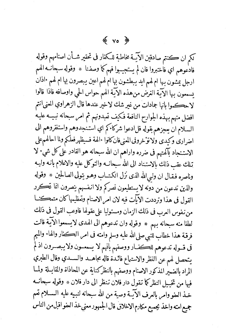 وقوله سبحانه لهم ألهم أرجل يمشون بها أم لهم أيد يبطشون بها أم لهم أعين يبصرون بها أم لهم آذان يسمعون بها الآية الغرض من هذه الآية ألهم حواس الحي وأوصافه فإذا قالوا لا حكموا بأنها جمادات من غير شك لا خير عندها قال الزهراوي المعنى أنتم أفضل منهم بهذه الجوارح النافعة فكيف تعبدونهم ثم أمر سبحانه نبيه عليه السلام أن يعجزهم بقوله قل ادعوا شركاءكم أي استنجدوهم واستنفروهم إلى إضراري وكيدي ولا تؤخروني المعنى فإن كانوا آلهة فسيظهر فعلكم ولما احالهم على الاستنجاد بآلهتهم في ضرره وأراهم أن الله سبحانه هو القادر على كل شيء لا تلك عقب ذلك بالإستناد إلى الله سبحانه والتوكل عليه والإعلام بأنه وليه وناصره فقا ان وليي الله الذي نزل الكتاب وهو يتولى الصالحين