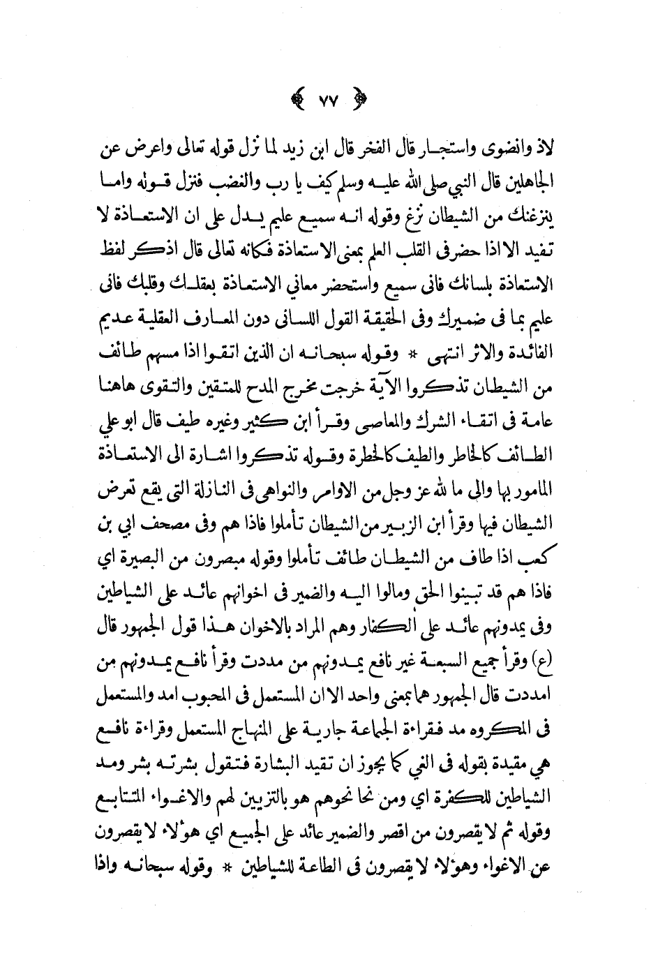 وقوله سبحانه إن الذين اتقوا إذا مسهم طائف من الشيطان تذكروا الآية خرجت مخرج المدح للمتقين والتقوى هاهنا عامة في اتقاء الشرك والمعاصي وقرأ ابن كثير وغيره طيف قال أبو علي الطائف كالخاطر والطيف كالخطرة وقوله تذكروا إشارة إلى الاستعاذة المأمور بها وإلى ما لله عز و جل من الأوامر والنواهي في النازلة التي يقع تعرض الشيطان فيها وقرأ ابن الزبير من الشيطان تأملوا فإذا هم وفي مصحف أبي بن كعب إذا طاف من الشيطان طائف تأملوا وقوله مبصرون من البصيرة أي فإذا هم قد تبينوا الحق ومالوا إليه والضمير في إخوانهم عائد على الشياطين وفي يمدونهم عائد على الكفار وهم المراد بالإخوان هذا قول الجمهور قال ع وقرأ جميع السبعة غير نافع يمدونهم من مددت وقرأ نافع يمدونهم من أمددت قال الجمهور هما بمعنى واحد إلا أن المستعمل في المحبوب أمد والمستعمل في المكروه مد فقراءة الجماعة جارية على المنهاج المستعمل وقراءة نافع هي مقيدة بقوله في الغي ما يجوز أن تقيد البشارة فتقول بشرته بشر ومد الشياطين للكفرة أي ومن نحا نحوهم هو بالتزيين لهم والإغواء المتتابع وقوله ثم لا يقصرون من أقصر والضمير عائد على الجميع أي هؤلاء لا يقصرون عن الإغواء وهؤلاء لا يقصرون في الطاعة للشياطين