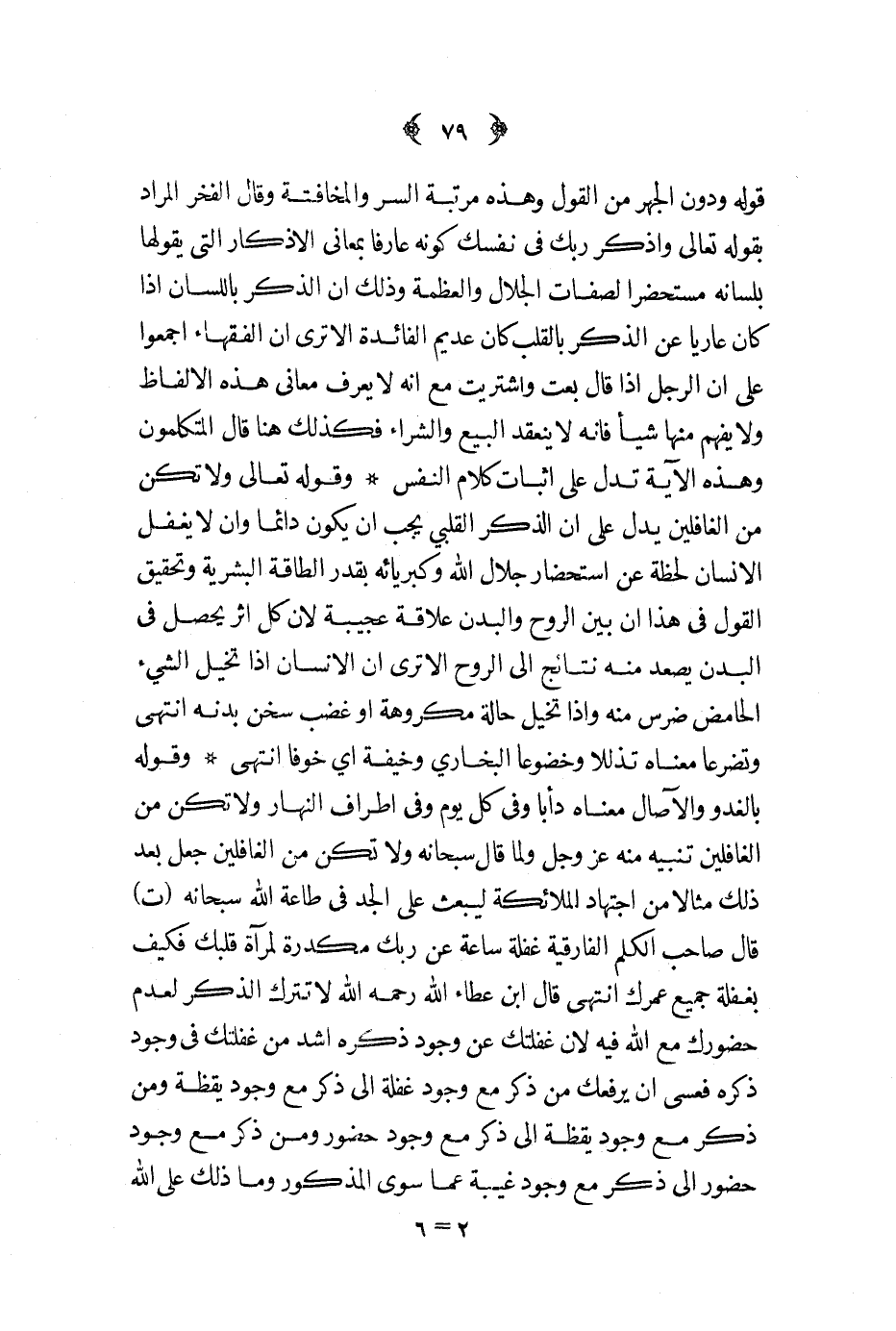 وقوله بالغدو والآصال معناه دأبا وفي كل يوم وفي أطراف النهار ولا تكن من الغافلين تنبيه منه عز و جل ولما قال سبحانه ولا تكن من الغافلين جعل بعد ذلك مثالا من اجتهاد الملائكة ليبعث على الجد في طاعة الله سبحانه ت قال صاحب الكلم الفارقية غفلة ساعة عن ربك مكدرة لمرآة قلبك فكيف بغفلة جميع عمرك انتهى قال ابن عطاء الله رحمه الله لا تترك الذكر لعدم حضورك مع الله فيه لأن غفلتك عن وجود ذكره أشد من غفلتك في وجود ذكره فعسى أن يرفعك من ذكر مع وجود غفلة إلى ذكر مع وجود يقظة ومن ذكر مع وجود يقظة إلى ذكر مع وجود حضور ومن ذكر مع وجود حضور إلى ذكر مع وجود غيبة عما سوى المذكور وما ذلك على الله