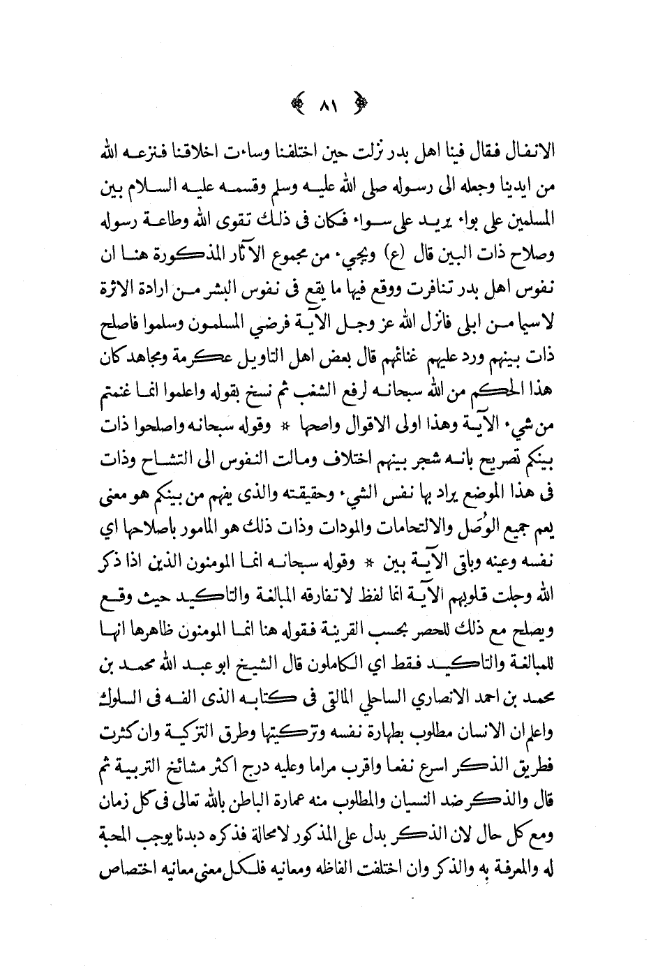 وقوله سبحانه واصلحوا ذات بينكم بأنه شجر بينهم اختلاف ومالت النفوس إلى التشاح وذات في هذا الموضع يراد بها نفس الشيء وحقيقته والذي يفهم من بينكم هو معنى يعم جميع الوصل والالتحامات والمودات وذات ذلك هو المأمور باصلاحها أي نفسه وعينه وباقي الآية بين وقوله سبحانه إنما المؤمنين الذين إذا ذكر الله وجلت قلوبهم الآية إنما لفظ لا تفارقه المبالغة والتأكيد حيث وقع ويصلح مع ذلك للحصر بحسب القرينة فقوله هنا إنما المؤمنون ظاهرها أنها للمبالغة والتأكيد فقط أي الكاملون قال الشيخ أبو عبد الله محمد بن محمد بن أحمد الأنصاري الساحلي المالقي في كتابه الذي ألفه في السلوك واعلم أن الإنسان مطلوب بطهارة نفسه وتزكيتها وطرق التزكية وإن كثرت فطريق الذكر أسرع نفعا وأقرب مراما وعليه درج أكثر مشائخ التربية ثم قال والذكر ضد النسيان والمطلوب منه عمارة الباطن بالله تعالى في كل زمان ومع كل حال لأن الذكر بدل على المذكور لا محالة فذكره دبدنا يوجب المحبة له والمعرفة به والذكر وإن اختلفت ألفاظه ومعانيه فلكل معنى معانيه اختصاص
