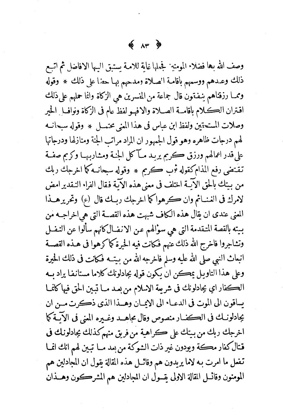 وقوله سبحانه كما أخرجك ربك من بيتك بالحق الآية اختلف في معنى هذه الآية فقال الفراء التقدير امض لأمرك في الغنائم وإن كرهوا كما أخرجك ربك قال ع وتحرير هذا المعنى عندي أن يقال هذه الكاف شبهت هذه القصة التي هي إخراجه من بيته بالقصة المتقدمة التي هي سؤالهم عن الأنفال كأنهم سألوا عن النفل وتشاجروا فأخرج الله ذلك عنهم فكانت فيه الخيرة كما كرهوا في هذه القصة انبعاث النبي صلى الله عليه و سلم فأخرجه الله من بيته فكانت في ذلك الخيرة وعلى هذا التأويل يمكن أن يكون قوله يجادلونك كلاما مستأنفا يراد به الكفار أي يجادلونك في شريعة الإسلام من بعد ما تبين الحق فيها كأنما يساقون إلى الموت في الدعاء إلى الإيمان وهذا الذي ذكرت من أن يجادلونك في الكفار منصوص وقال مجاهد وغيره المعنى في الآية كما أخرجك ربك من بيتك على كراهية من فريق منهم كذلك يجادلونك في قتال كفار مكة ويودون غير ذلك الشوكة من بعد ما تبين لهم أنك إنما تفعل ما أمرت به لاما يريدون هم وقائل هذه المقالة يقول أن المجادلين هم المؤمنون وقائل المقالة الأولى يقول أن المجادلين هم المشركون وهذان