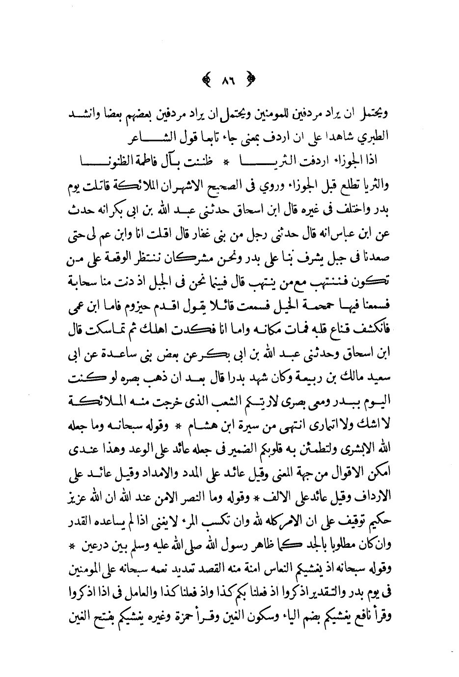 ويحتمل أن يراد مردفين للمؤمنين ويحتمل أن يراد مردفين بعضهم بعضا وأنشد الطبري شاهدا على أن أردف بمعنى جاء تابعا قول الشاعر ... إذا الجوزاء أردفت الثريا ... ظننت بآل فاطمة الظنونا ...