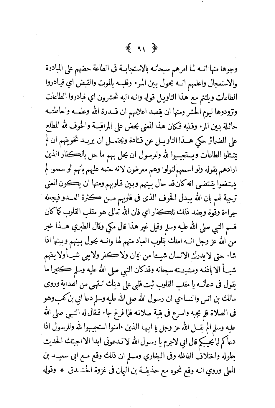 وجوها منها أنه لما أمرهم سبحانه بالاستجابة في الطاعة حضهم على المبادرة والاستعجال وأعلمهم أنه يحول بين المرء وقلبه بالموت والقبض أي فبادروا الطاعات ويلتئم مع هذا التأويل قوله وإنه إليه تحشرون أي فبادروا الطاعات وتزودوها ليوم الحشر ومنها أن يقصد أعلامهم أن قدرة الله وعلمه وإحاطته حائلة بين المرء وقلبه فكان هذا المعنى يحض على المراقبة والخوف لله المطلع على الضمائر حكي هذا التأويل عن قتادة ويحتمل أن يريد تخويفهم إن لم يمتثلوا الطاعات ويستجيبوا لله وللرسول أن يحل بهم ما حل بالكفار الذين أرادهم بقوله ولو أسمعهم لتولوا وهم معرضون لأنه حتمه عليهم بأنهم لو سمعوا لم ينتفعوا يقتضي أنه كان قد حال بينهم وبين قلوبهم ومنا أن يكون المعنى ترجية لهم بأن الله يبدل الخوف الذي في قلوبهم من كثرة العدو فيجعله جراءة وقوة وبضد ذلك للكفار أي فإن الله تعالى هو مقلب القلوب كما كان قسم النبي صلى الله عليه و سلم وقيل غير هذا قال مكي وقال الطبري هذا خبر من الله عز و جل أنه أملك بقلوب العباد منهم لها وأنه يحول بينهم وبينها إذا شاء حتى لا يدرك الإنسان شيئا من إيمان ولا كفر ولا يعي شيئا ولا يفهم شيئا إلا بإذنه ومشيئته سبحانه وقد كان النبي صلى الله عليه و سلم كثيرا ما يقول في دعائه يا مقلب القلوب ثبت قلبي على دينك انتهى