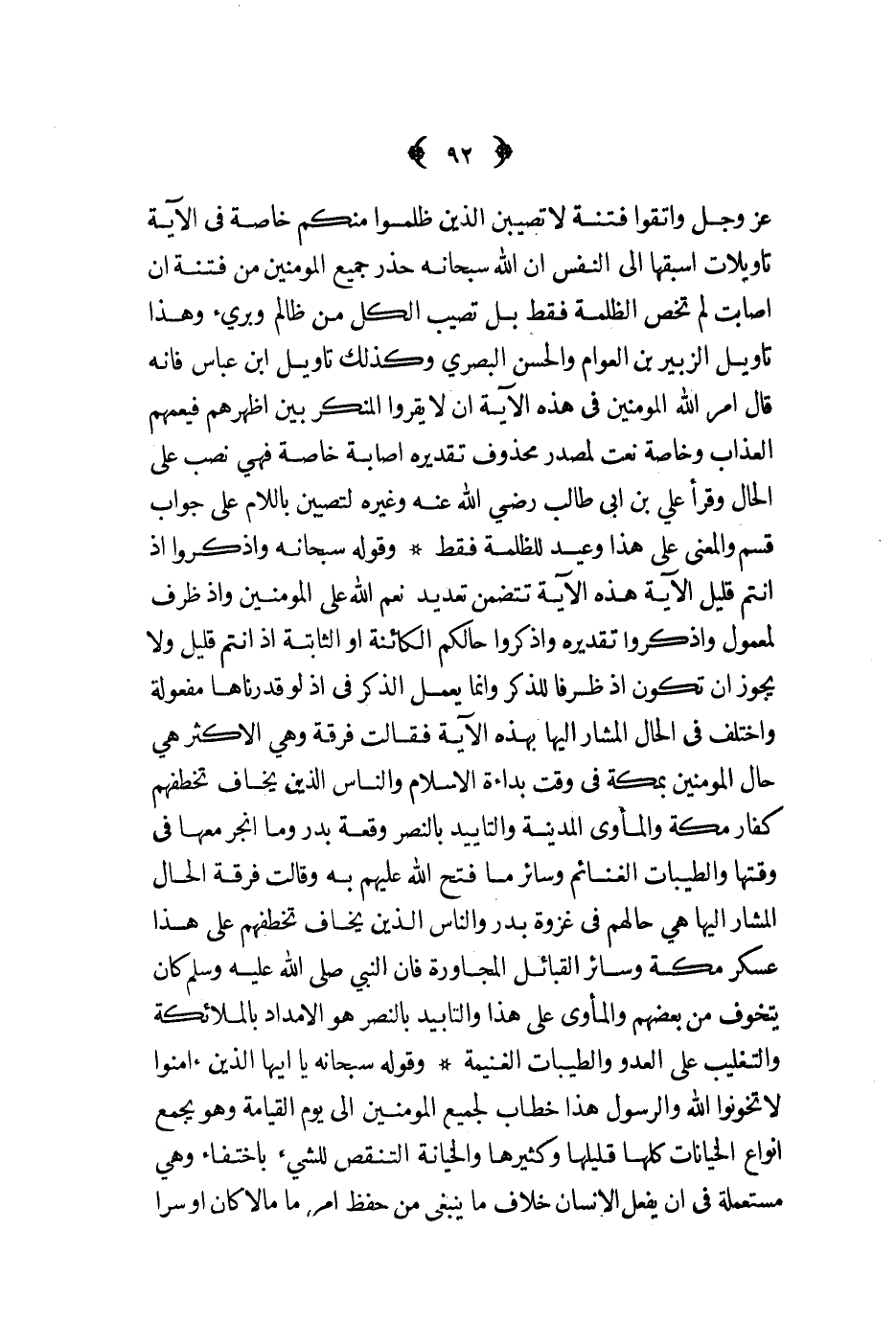 عز و جل واتقوا فتنة لا تصبين الذين ظلموا منكم خاصة في الآية تأويلات أسبقها إلى النفس أن الله سبحانه حذر جميع المؤمنين من فتنة أن أصابت لم تخص الظلمة فقط بل تصيب الكل من ظالم وبريء وهذا تأويل الزبير بن العوام والحسن البصري وكذلك تأويل ابن عباس فإنه قال أمر الله المؤمنين في هذه الآية أن لا يقروا المنكر بين أظهرهم فيعمهم العذاب وخاصة نعت لمصدر محذوف تقديره إصابة خاصة فهي نصب على الحال وقرأ علي بن أبي طالب رضي الله عنه وغيره لتصيبن باللام على جواب قسم والمعنى على هذا وعيد للظلمة فقط