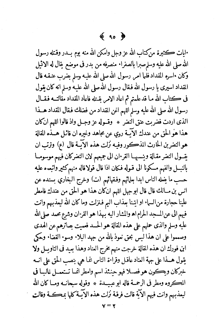 آيات كثيرة من كتاب الله عز و جل وأمكن الله منه يوم بدر وقتله رسول الله صلى الله عليه و سلم صبرا بالصفراء منصرفة من بدر في موضع يقال له الأثيل وكان أسره المقداد فلما أمر رسول الله صلى الله عليه و سلم بضرب عنقه قال المقداد أسيري يا رسول الله فقال رسول الله صلى الله عليه و سلم إنه كان يقول في كتاب الله ما قد علمتم ثم أعاد الأمر بقتله فأعاد المقداد مقالته فقال رسول الله صلى الله عليه و سلم اللهم أغن المقداد من فضلك فقال المقداد هذا الذي أردت فضربت عنق النضر