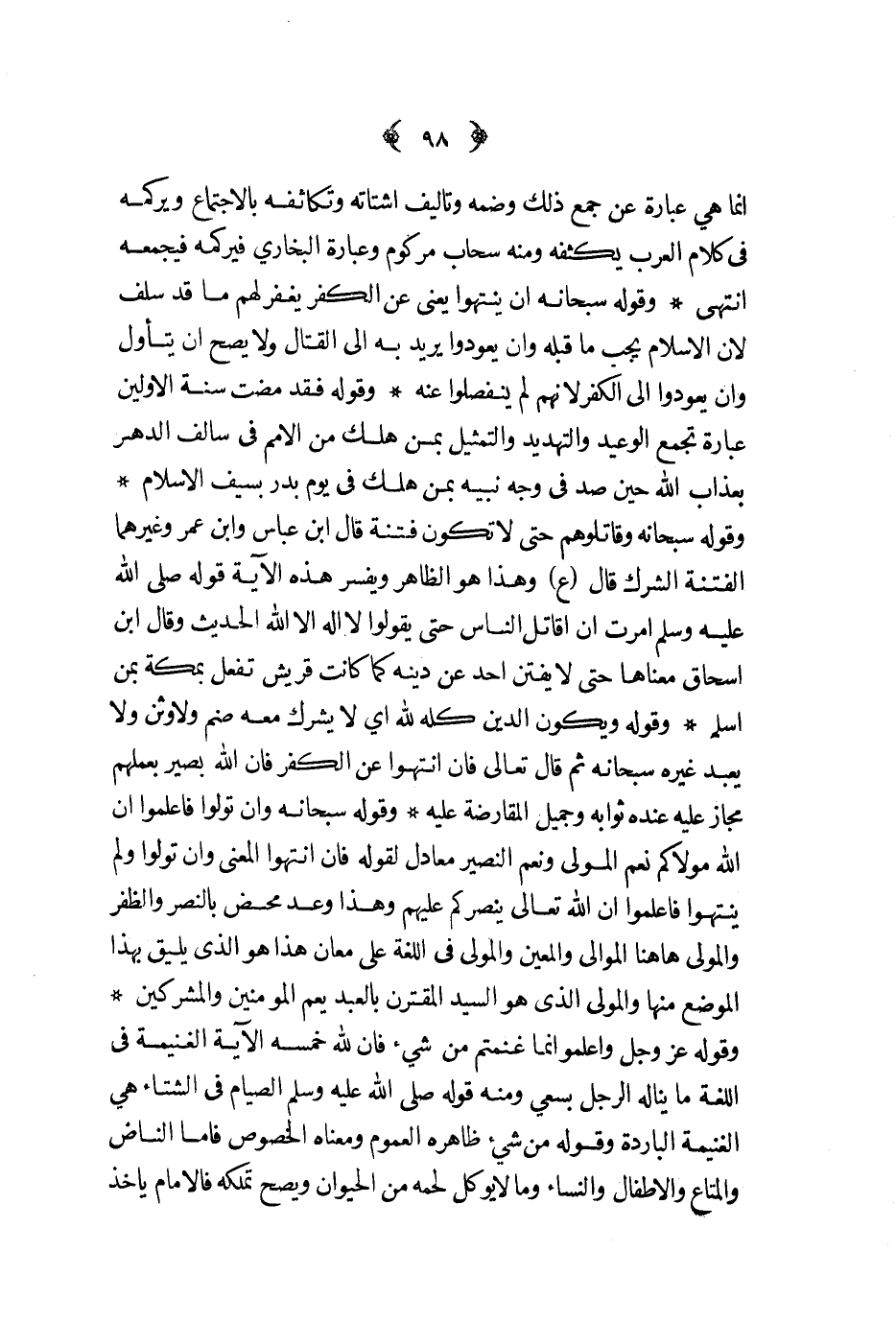 وقوله سبحانه وقاتلوهم حتى لا تكون فتنة قال ابن عباس وابن عمر وغيرهما الفتنة الشرك قال ع وهذا هو الظاهر ويفسر هذه الآية قوله صلى الله عليه و سلم أمرت أن أقاتل الناس حتى يقولوا لا إله إلا الله الحديث وقال ابن إسحاق معناها حتى لا يفتن أحد عن دينه كماكانت قريش تفعل بمكة بمن أسلم