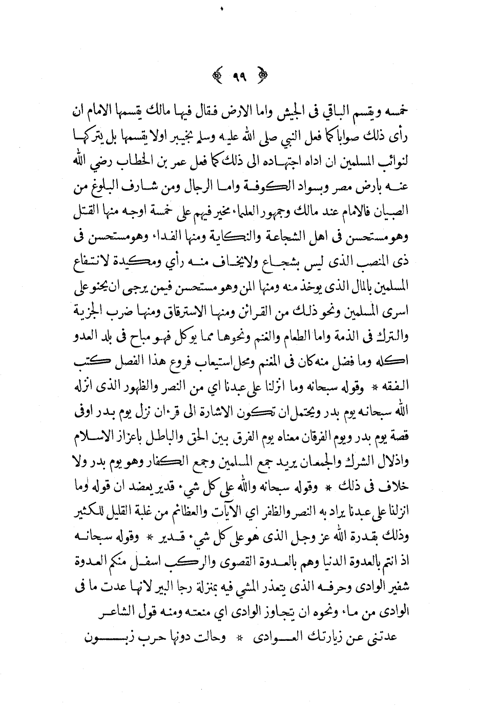 خمسه ويقسم الباقي في الجيش وأما الأرض فقال فيها مالك يقسمها الإمام إن رأى ذلك صوابا كما فعل النبي صلى الله عليه و سلم بخيبر أو لا يقسمها بل يتركها لنوائب المسلمين إن أداه اجتهاده إلى ذلك كما فعل عمر بن الخطاب رضي الله عنه بأرض مصر وبسواد الكوفة وأما الرجال ومن شارف البلوغ من الصبيان فالإمام عند مالك وجمهور العلماء مخير فيهم على خمسة أوجه منها القتل وهو مستحسن في أهل الشجاعة والنكاية ومنها الفداء وهو مستحسن في ذي المنصب الذي ليس بشجاع ولا يخاف منه رأي ومكيدة لانتفاع المسلمين بالمال الذي يؤخذ منه ومنها المن وهو مستحسن فيمن يرجى أن يحنو على أسرى المسلمين ونحو ذلك من القرائن ومنها الاسترقاق ومنها ضرب الجزية والترك في الذمة وأما الطعام والغنم ونحوها مما يكل فهو مباح في بلد العدو أكله وما فضل منه كان في المغنم ومحل استيعاب فروع هذا الفصل كتب الفقه