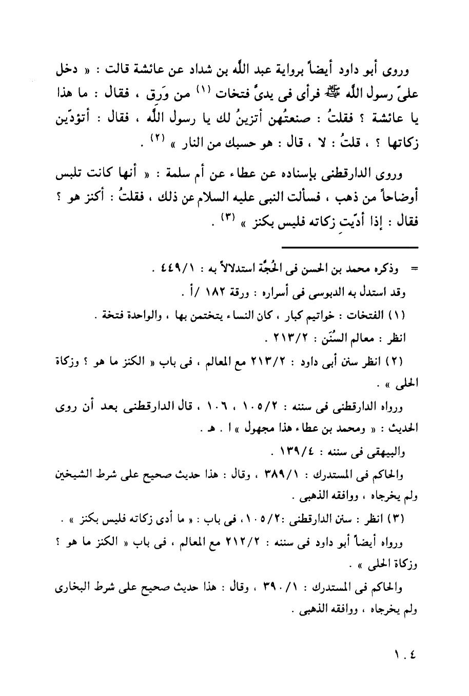 وروى أبو داود أيضاً برواية عبد الله بن شداد عن عائشة قالت: ((دخل على رسول الله - صلى الله عليه وسلم - فرأى في يدي فتخات من ورق، فقال: ما هذا يا عائشة؟ فقلت: صنعتهن أتزين لك يا رسول الله، فقال: أتؤدين زكاتها؟، قلت: لا، قال: هو حسبك من النار)).