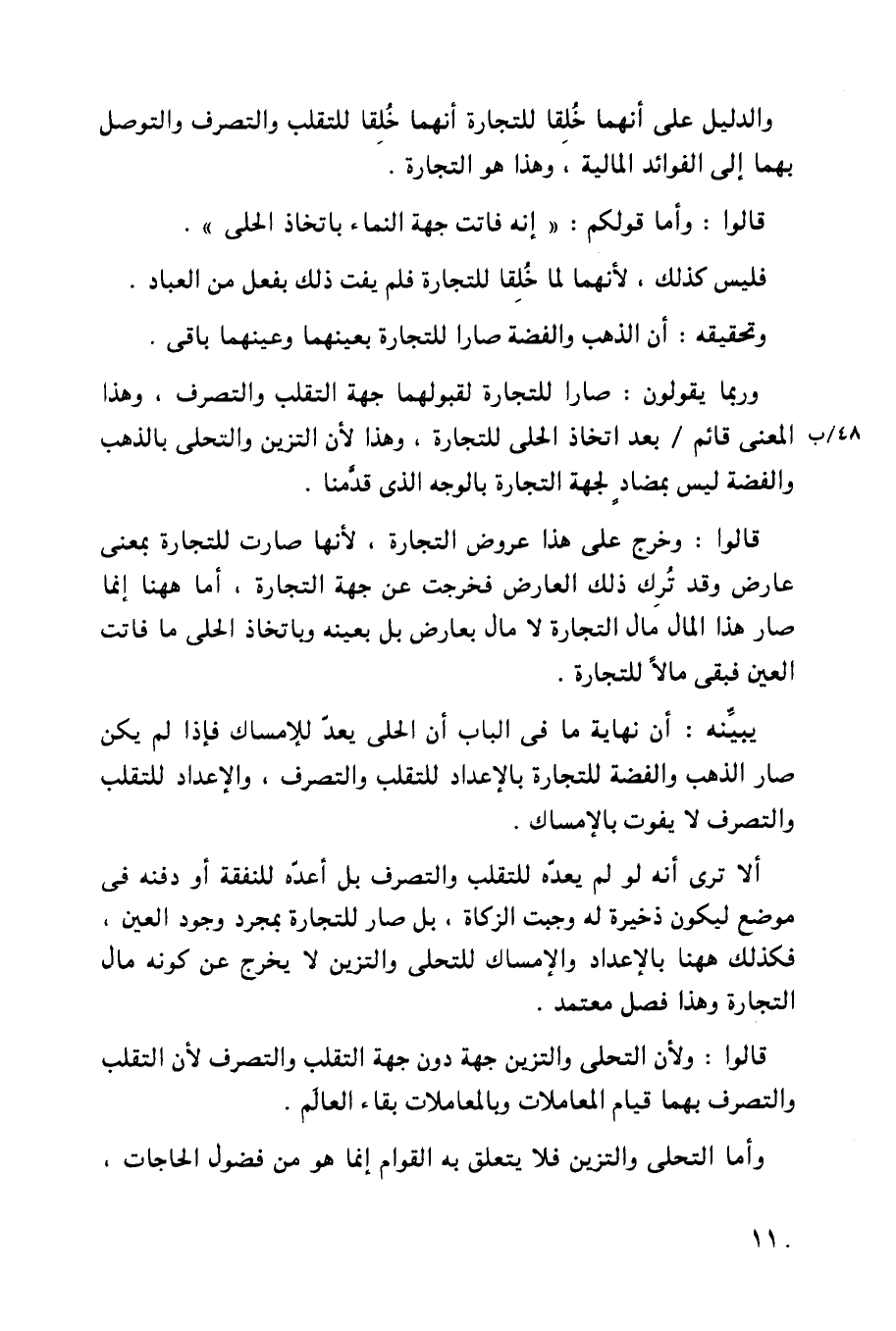 وربما يقولون: صارا للتجارة لقبولهما جهة التقلب والتصرف، وهذا المعنى قائم/ بعد اتخاذ الحلي للتجارة، وهذا لأن التزين والتحلي بالذهب والفضة ليس بمضاد لجهة التجارة بالوجه الذي قدمنا.