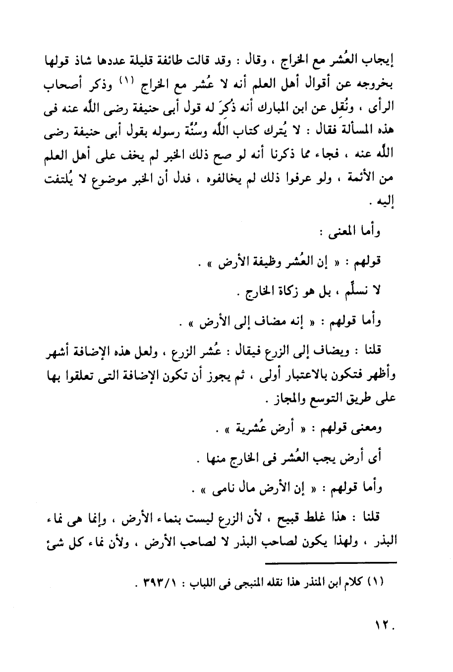 إيجاب العشر من الخراج، وقال: وقد قالت طائفة قليلة عددها شاذ قولها بخروجه عن أقوال أهل العلم أنه لا عشر مع الخراج وذكر أصحاب الرأي، ونقل عن ابن المبارك أنه ذكر له قول أبي حنيفة رضي الله عنه في هذه المسألة فقال: لا يترك كتاب الله وسنة رسوله بقول أبي حنيفة رضي الله عنه، فجاء مما ذكرنا أنه لو صح ذلك الخبر لم يخف على أهل العلم من الأئمة، ولو عرفوا ذلك لم يخالفوه، فدل أن الخبر موضوع لا يلتفت إليه.