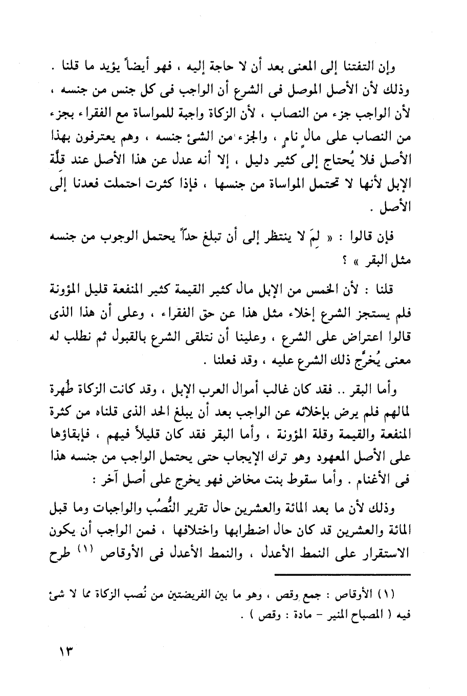 وإن التفتنا إلى المعنى بعد أن لا حاجة إليه، فهو أيضاً يؤيد ما قلنا. وذلك لأن الأصل الموصل في الشرع أن الواجب في كل جنس من جنسه، لأن الواجب جزء من النصاب، لأن الزكاة واجبة للمواساة مع الفقراء بجزء من النصاب على مال نام، والجزء من الشيء جنسه، وهم يعترفون بهذا الأصل فلا يحتاج إلى كثير دليل، إلا أنه عدل عن هذا الأصل عند قلة الإبل لأنها لا تحتمل المواساة من جنسها، فإذا كثرت احتملت فعدنا إلى الأصل.