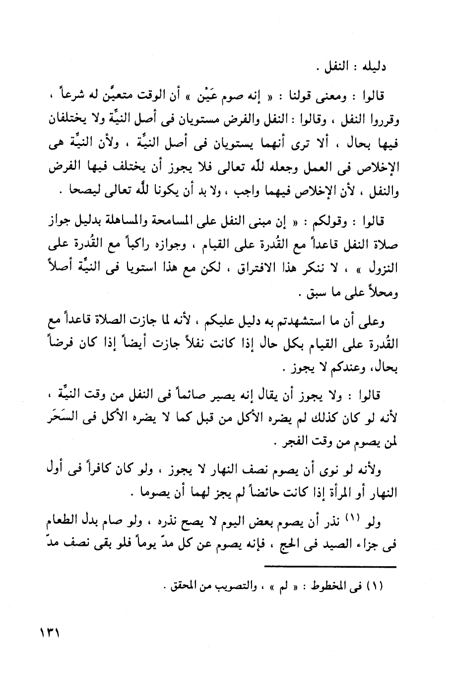 قالوا: وقولكم: ((إن مبنى النفل على المسامحة والمساهلة بدليل جواز صلاة النفل قاعداً مع القدرة على القيام، وجوازه راكباً مع القدرة على النزول))، لا ننكر هذا الافتراق، لكن مع هذا استويا في النية أصلاً ومحلاً على ما سبق.