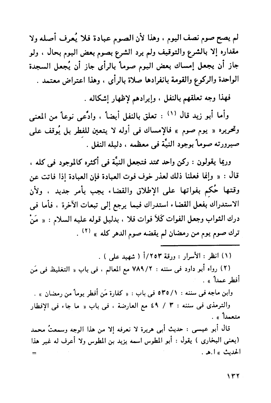 وربما يقولون: ركن واحد ممتد فتجعل النية في أكثره كالموجود في كله، قال: ((وإنما فعلناه ذلك لعذر خوف فوت العبادة فإن العبادة إذا فاتت عن وقتها حكم بفواتها على الإطلاق والقضاء يجب بأمر جديد، ولأن الاستدراك بفعل القضاء استدراك فيما يرجع إلى تبعات الآخرة، فأما في درك الثواب وجعل الفوات كلا فوات فلا، بدليل قوله عليه السلام: ((من ترك صوم يوم من رمضان لم يقضه صوم الدهر كله)).
