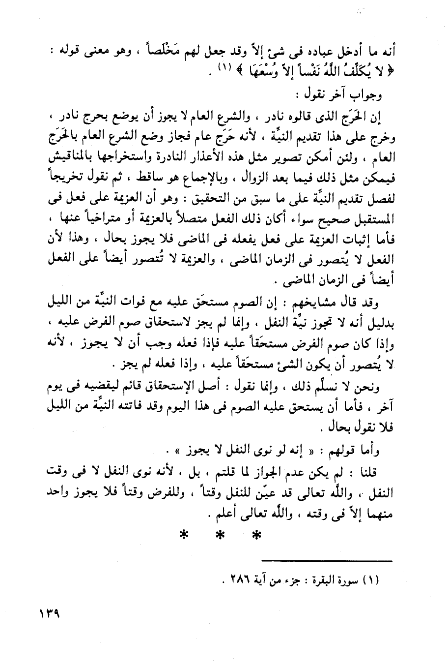 إن الحرج الذي قالوه نادر، والشرع العام لا يجوز أن يوضع بحرج نادر، وخرج على هذا تقديم النية، لأنه حرج عام فجاز وضع الشرع العام بالحرج العام، ولئن أمكن تصوير مثل هذه الأعذار النادرة واستخراجها بالمناقيش فيمكن مثل ذلك فيما بعد الزوال، وبالإجماع هو ساقط، ثم نقول تخريجاً لفصل تقديم النية على ما سبق من التحقيق: وهو أن العزيمة على فعل في المستقبل صحيح سواء أكان ذلك الفعل متصلاً بالعزيمة أو متراخياً عنها، فأما إثبات العزيمة على فعل يفعله في الماضي فلا يجوز بحال، وهذا لأن الفعل لا يتصور في الزمان الماضي، والعزيمة لا تتصور أيضاً على الفعل أيضاً في الزمان الماضي.