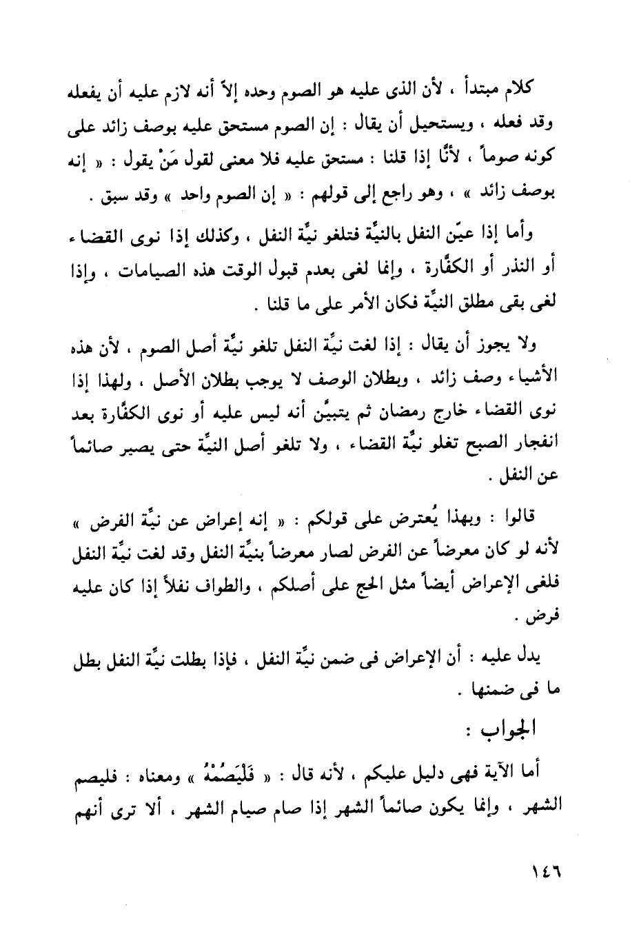 ولا يجوز أن يقال: إذا لغت نية النفل تلغو نية أصل الصوم، لأن هذه الأشياء وصف زائد، وبطلان الوصف لا يوجب بطلان الأصل، ولهذا إذا نوى القضاء خارج رمضان ثم يتبين أنه ليس عليه أو نوى الكفارة بعد انفجار الصبح تغلو نية القضاء، ولا تلغو أصل النية حتى يصير صائماً عن النفل.