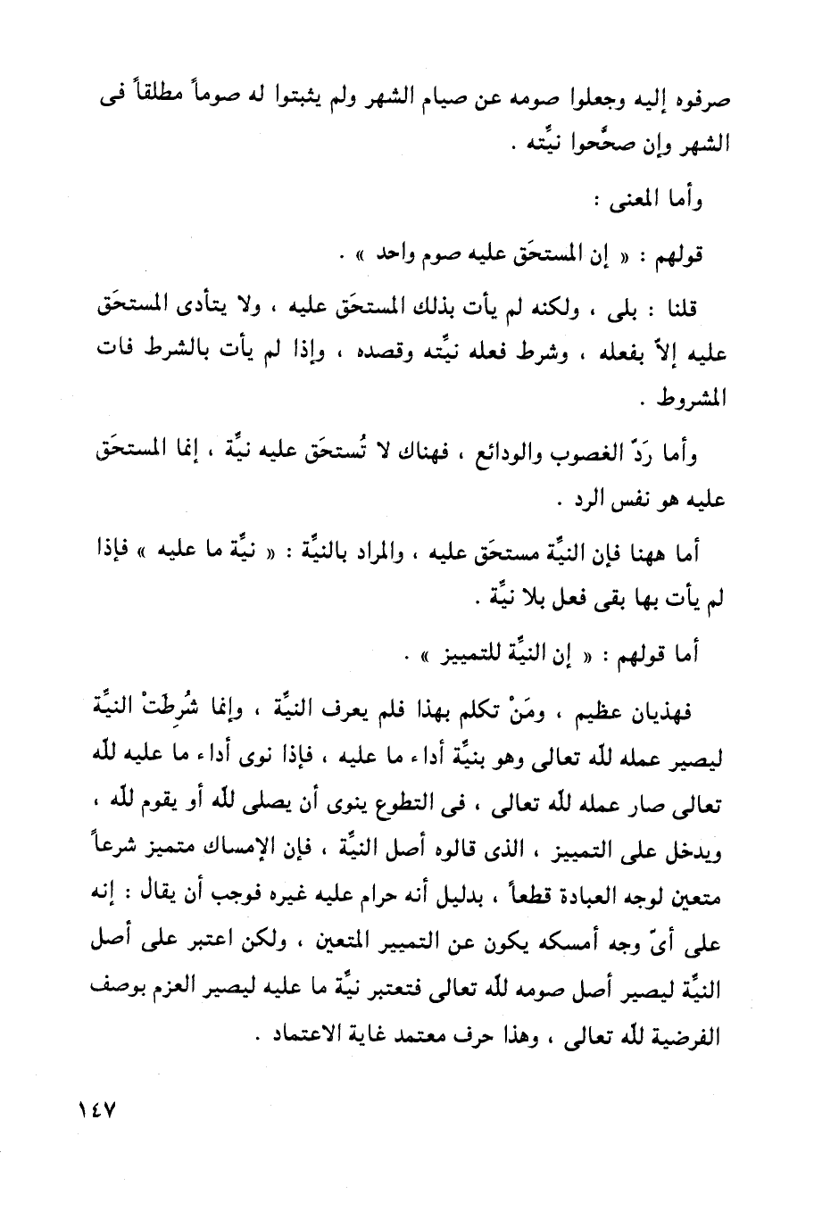 فهذيان عظيم، ومن تكلم بهذا قلم يعرف النية، وإنما شرطت النية ليصير عمله لله تعالى وهو بنية أداء ما عليه، فإذا نوى أداء ما عليه لله تعالى صار عمله لله تعالى، في التطوع ينوي أن يصلي لله أو يقوم لله، ويدخل على التمييز، الذي قالوه أصل النية، فإن الإمساك متميز شرعاً متعين لوجه العبادة قطعاً، بدليل أنه حرام عليه غيره فوجب أن يقال: إنه على أي وجه أمسكه يكون عن التمييز المتعين، ولكن اعتبر على أصل النية ليصير أصل صومه لله تعالى فتعتبر نية ما عليه ليصير العزم بوصف الفرضية لله تعالى، وهذا حرف معتمد غاية الاعتماد.