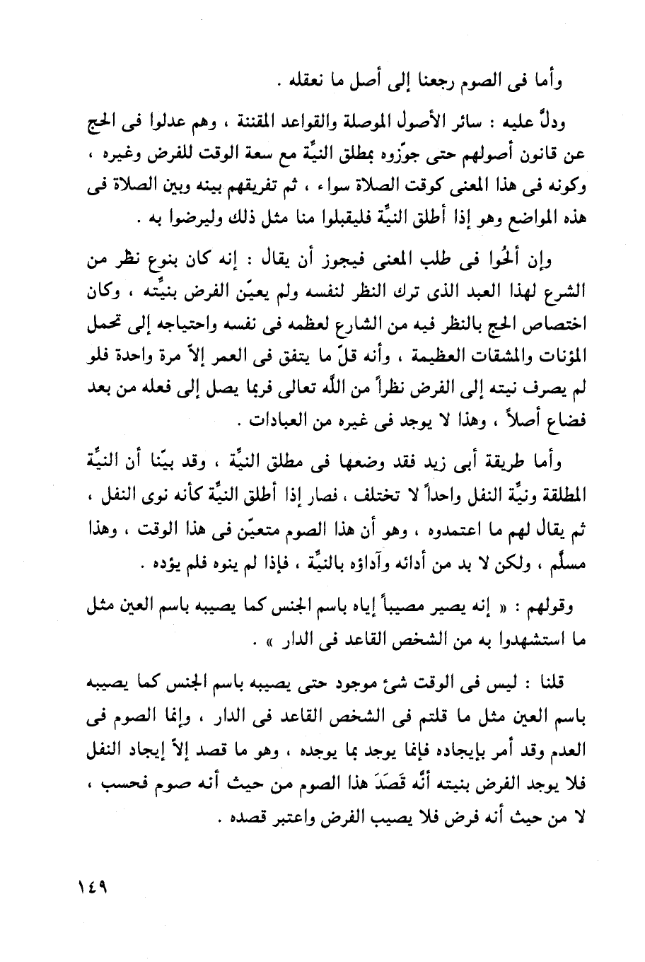 قلنا: ليس في الوقت شيء موجود حتى يصيبه باسم الجنس كما يصيبه باسم العين مثل ما قلتم في الشخص القاعد في الدار، وإنما الصوم في العدم وقد أمر بإيجاده فإنما يوجد بما يوجده، وهو ما قصد إلا إيجاد النفل فلا يوجد الفرض بنيته أنه قصد هذا الصوم من حيث أنه صوم فحسب، لا من حيث أنه فرض فلا يصيب الفرض واعتبر قصده.