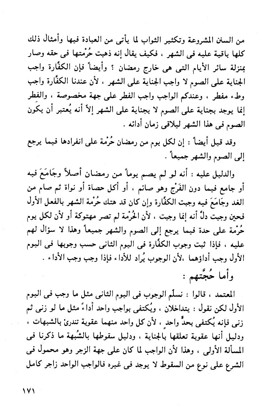 من السنن المشروعة وتكثير الثواب لما يأتي من العبادة فيها وأمثال ذلك كلها باقية عليه في الشهر، فكيف يقال إنه ذهبت حرمتها في حقه وصار بمنزلة سائر الأيام التي هي خارج رمضان؟ وأيضاً فإن الكفارة واجب الجناية على الصوم لا واجب الجناية على الشهر، لأن عندنا الكفارة واجب وطء مفطر، وعندكم الواجب واجب الفطر على جهة مخصوصة، والفطر إنما يوجد بجناية على الصوم لا بجناية على الشهر إلا أنه يعتبر أن يكون الصوم في هذا الشهر ليلاقي زمان أدائه.