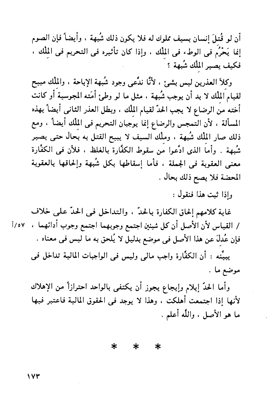 وكلا العذرين ليس بشيء، لأنا ندعي وجود شبهة الإباحة، والملك مبيح لقيام الملك لابد أن يوجب شبهة، مثل ما لو وطئ أمته المجوسية أو كانت أخته من الرضاع لا يجب الحد لقيام الملك، وبطل العذر الثاني أيضاً بهذه المسألة، لأن التمجس والرضاع إنما يوجبان التحريم في الملك أيضاً، ومع ذلك صار الملك شبهة، وملك السيف لا يبيح القتل به بحال حتى يصير شبهة. وأما الذي ادعوا من سقوط الكفارة بالغلظ، فلأن في الكفارة معنى العقوبة في الجملة، فأما إسقاطها بكل شبهة وإلحاقها بالعقوبة المحضة فلا يصح ذلك بحال.