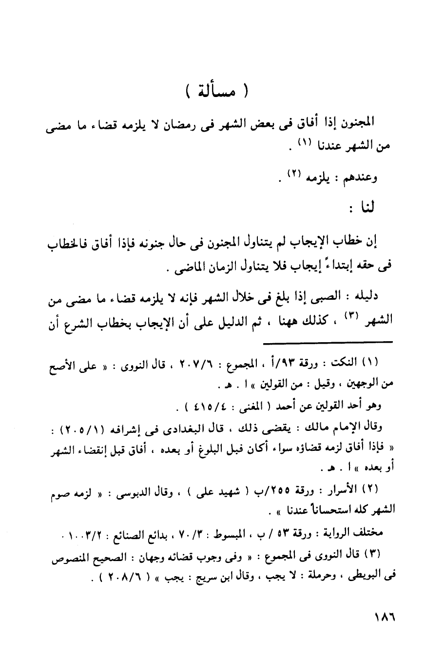 إن خطاب الإيجاب لم يتناول المجنون في حال جنونه فإذا أفاق فالخطاب في حقه ابتداء إيجاب فلا يتناول الزمان الماضي.