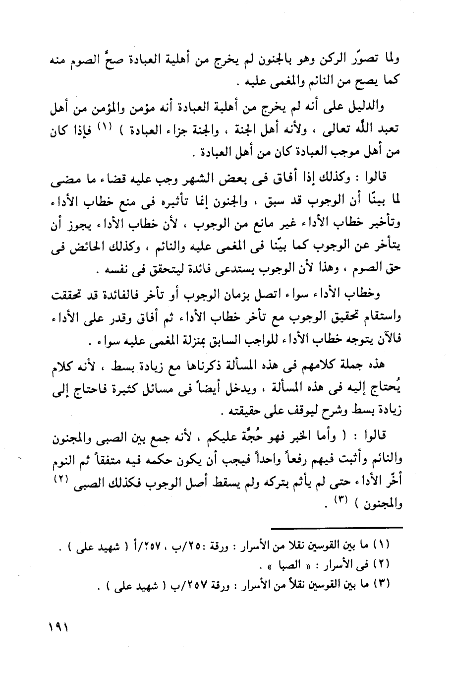 قالوا: (وأما الخبر فهو حجة عليكم، لأنه جمع بين الصبي والمجنون والنائم وأثبت فيهم رفعاً واحداً فيجب أن يكون حكمه فيه متفقاً ثم النوم أخر الأداء حتى لم يأثم بتركه ولم يسقط أصل الوجوب فكذلك الصبي والمجنون).