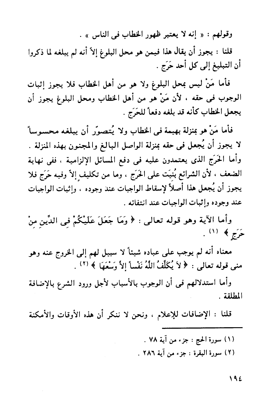 فأما من هو بمنزلة بهيمة في الخطاب ولا يتصور أن يبلغه محسوساً لا يجوز أن يجعل في حقه بمنزلة الواصل البالغ والمجنون بهذه المنزلة. وأما الحرج الذي يعتمدون عليه في دفع المسائل الإلزامية، ففي نهاية الضعف، لأن الشرائع بنيت على الحرج، وما من تكليف إلا وفيه حرج فلا يجوز أن يجعل هذا أصلاً لإسقاط الواجبات عند وجوده، وإثبات الواجبات عند وجوده وإثبات الواجبات عند انتفائه.