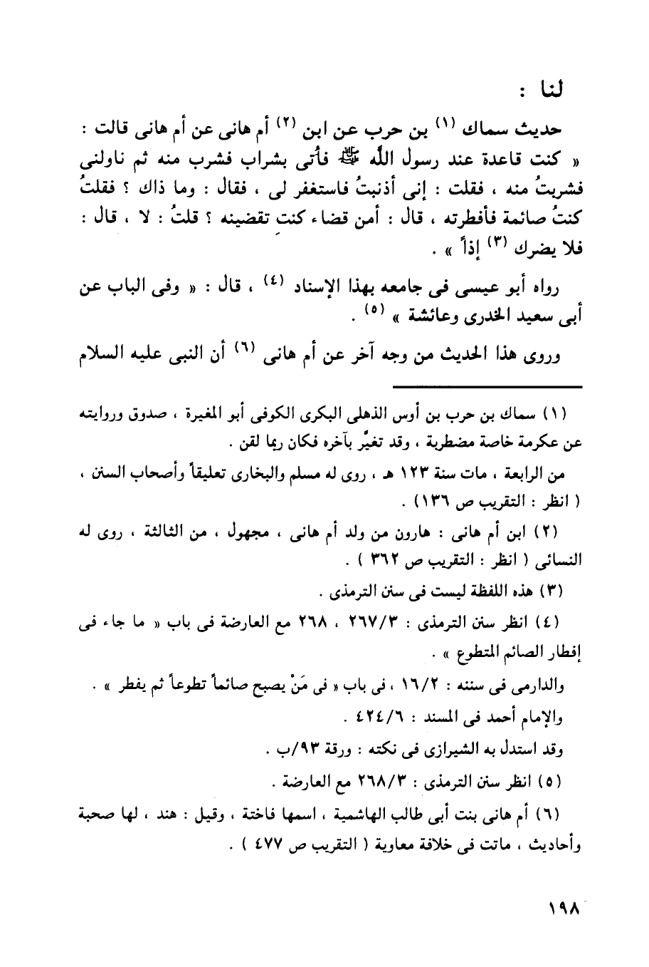 حديث سماك بن حرب عن ابن أم هاني عن أم هاني قالت: ((كنت قاعدة عند رسول الله - صلى الله عليه وسلم - فأتى بشراب فشرب منه ثم ناولن فشربت منه، فقلت: إني أذنبت فاستغفر لي، فقال: ما ذاك؟ فقلت كنت صائمة فأفطرته، قال: أمن قضاء كنت تقضينه؟ قلت: لا، قال: فلا يضرك إذا)).