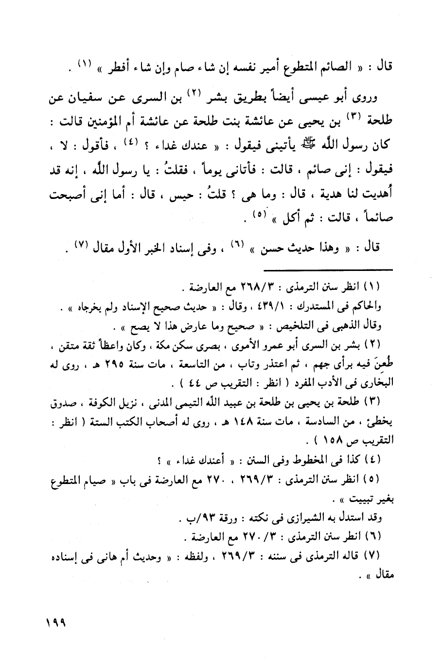 وروى أبو عيسى أيضاً بطريق بشر بن السري عن سفيان عن طلحة بن يحيى عن عائشة بنت طلحة عن عائشة أم المؤمنين قالت: كان رسول الله - صلى الله عليه وسلم - يأتيني فيقول: ((عندك غداء؟، فأقول: لا، فيقول: إني صائم، قالت: فأتاني يوماً، فقلت: يا رسول الله، إنه قد أهديت لنا هدية، قال: وما هي؟ قلت: حيس، قال: أما إني أصبحت صائماً، قالت: ثم أكل)).