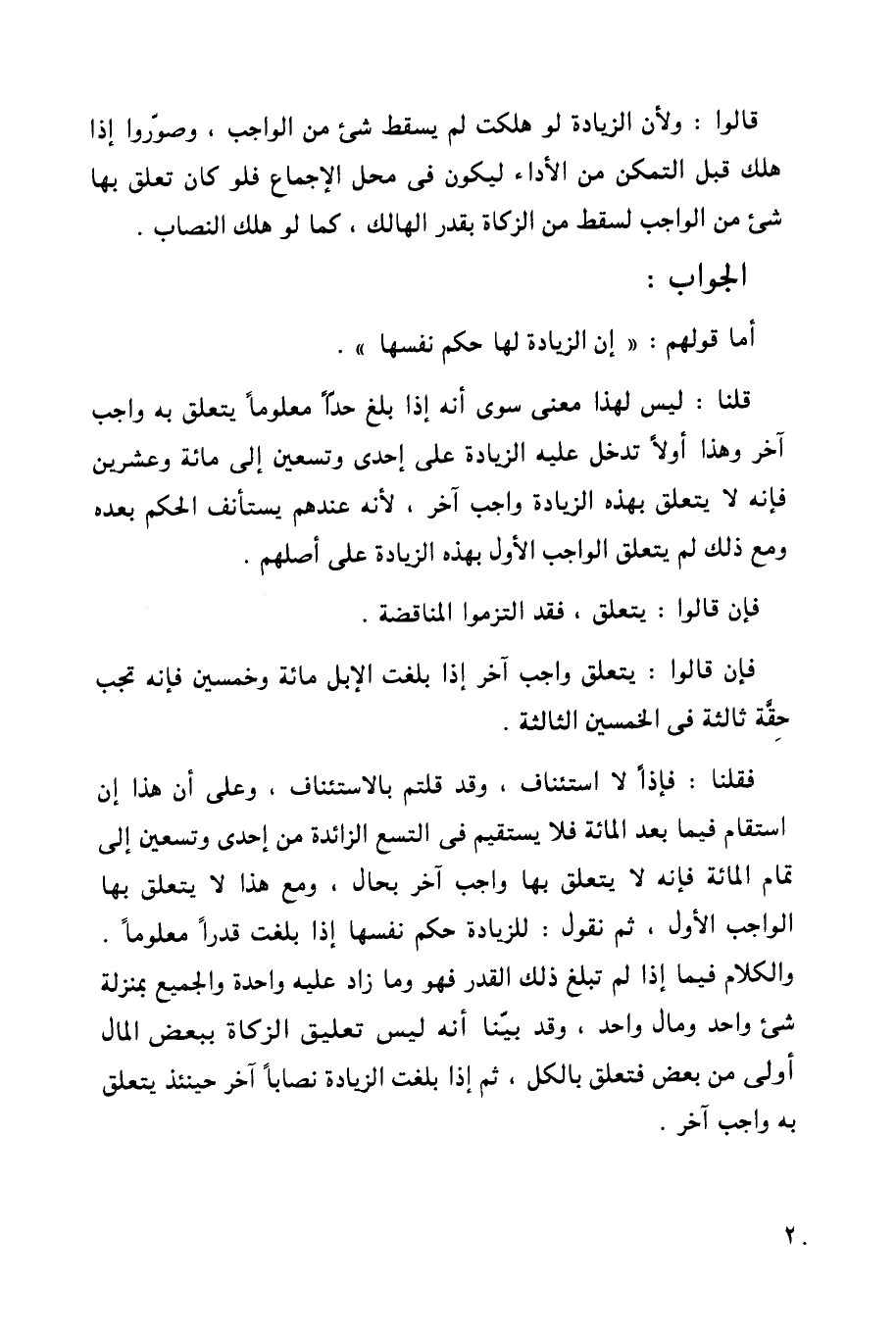 فقلنا: فإذا لا استئناف، وقد قلتم بالاستئناف، وعلى أن هذا إن استقام فيما بعد المائة فلا يستقيم في التسع الزائدة من إحدى وتسعين إلى تمام المائة فإنه لا يتعلق بها واجب آخر بحال، ومع هذا لا يتعلق بها الواجب الأول، ثم نقول: للزيادة حكم نفسها إذا بلغت قدراً معلوماً. والكلام فيما إذا لم تبلغ ذلك القدر فهو وما زاد عليه واحدة والجميع بمنزلة شيء واحد ومال واحد، وقد بينا أنه ليس تعليق الزكاة ببعض المال أولى من بعض فتعلق بالكل، ثم إذا بلغت الزيادة نصاباً آخر حينئذ يتعلق به واجب آخر.