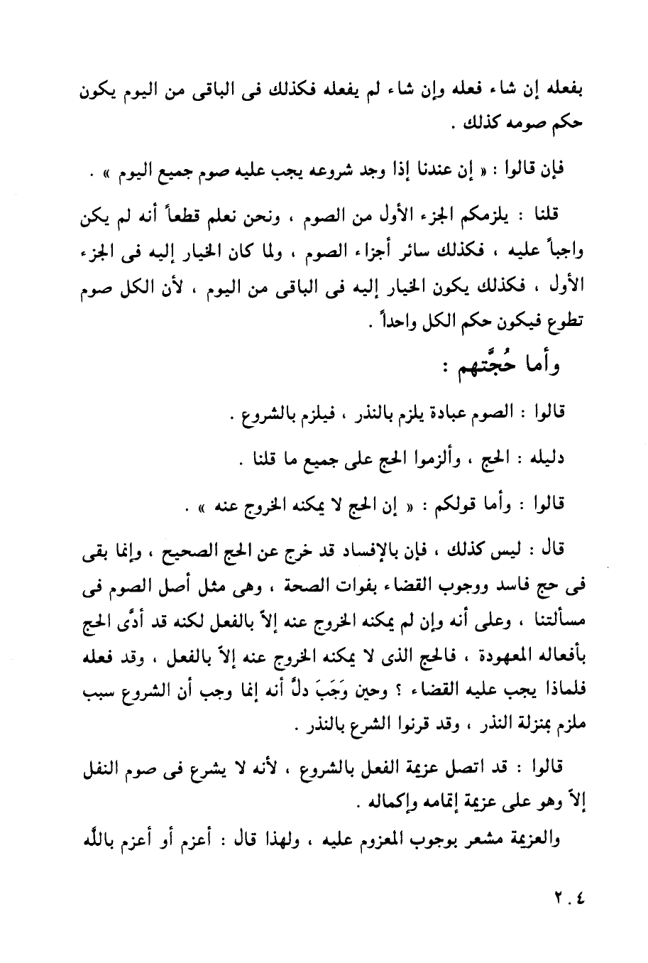 قال: ليس كذلك، فإن بالإفساد قد خرج عن الحج الصحيح، وإنما بقى في حج فاسد ووجوب القضاء بفوات الصحة، وهي مثل أصل الصوم في مسألتنا، وعلى أنه وإن لم يمكنه الخروج عنه إلا بالفعل لكنه قد أدى الحج بأفعاله المعهودة، فالحج الذي لا يمكنه الخروج عنه إلا بالفعل، وقد فعله فلماذا يجب عليه القضاء؟ وحين وجب دل أنه إنما وجب أن الشروع سبب ملزم بمنزلة النذر، وقد قرنوا الشرع بالنذر.