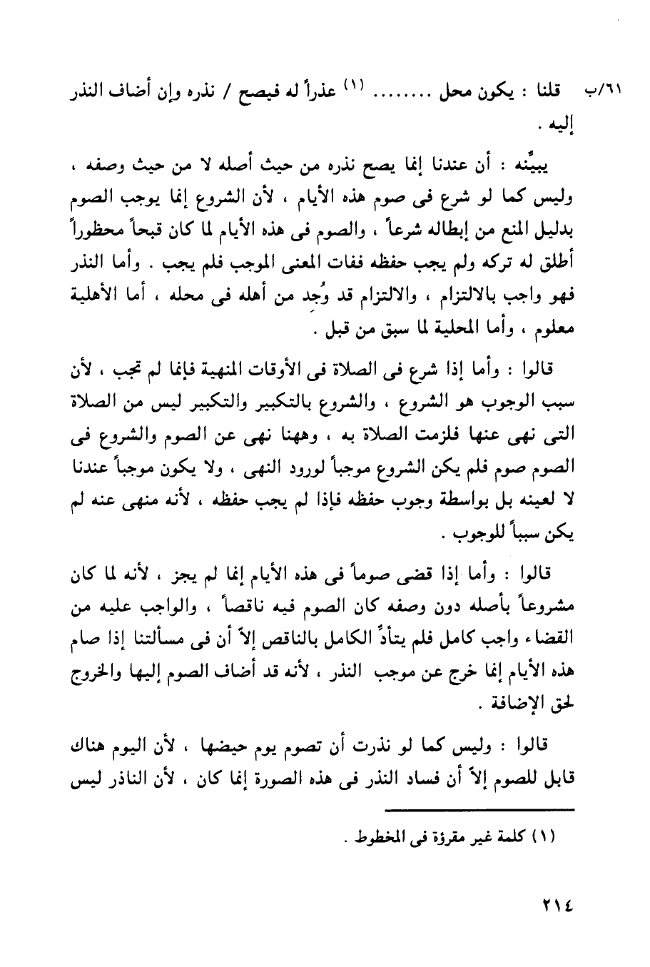 يبينه: أن عندنا إنما يصح نذره من حيث أصله لا من حيث وصفه، وليس كما لو شرع في صوم هذه الأيام، لأن الشروع إنما يوجب الصوم بدليل المنع من إبطاله شرعاً، والصوم في هذه الأيام لما كان قبحاً محظوراً أطلق له تركه ولم يجب حفظه ففات المعنى الموجب فلم يجب. وأما النذر فهو واجب بالالتزام، والالتزام قد وجد من أهله في محله، أما الأهلية معلوم، وأما المحلية لما سبق من قبل.