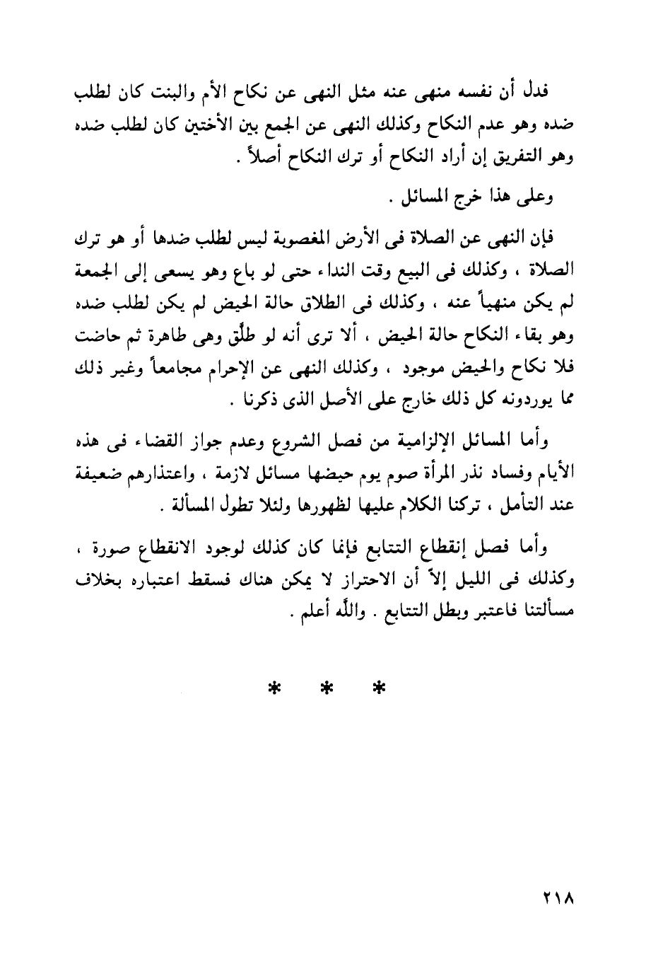 فإن النهي عن الصلاة في الأرض المغصوبة ليس الطلب ضدها أو هو ترك الصلاة، وكذلك في البيع وقت النداء حتى لو باع وهو يسعى إلى الجمعة لم يكن منهياً عنه، وكذلك في الطلاق حالة الحيض لم يكن لطلب ضده وهو بقاء النكاح حالة الحيض، ألا ترى أنه لو طلق وهي طاهرة ثم حاضت فلا نكاح والحيض موجود، وكذلك النهي عن الإحرام مجامعاً وغير ذلك مما يوردونه كل ذلك خارج على الأصل الذي ذكرنا.
