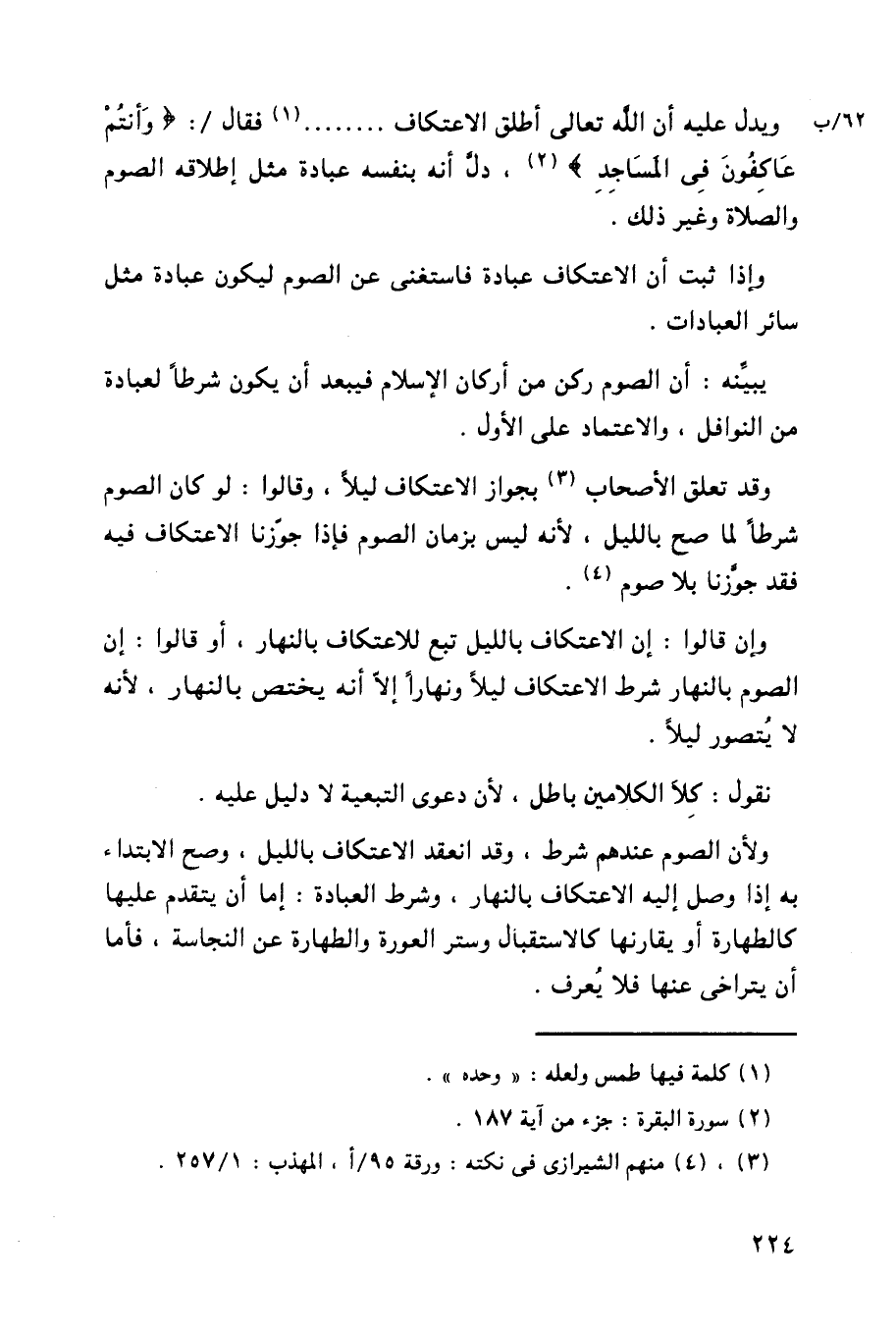 ويدل عليه أن الله تعالى أطلق الاعتكاف ........ فقال/: {وَأَنتُمْ عَاكِفُونَ فِي الْمَسَاجِدِ}، دل أنه بنفسه عبادة مثل إطلاقه الصوم والصلاة وغير ذلك.