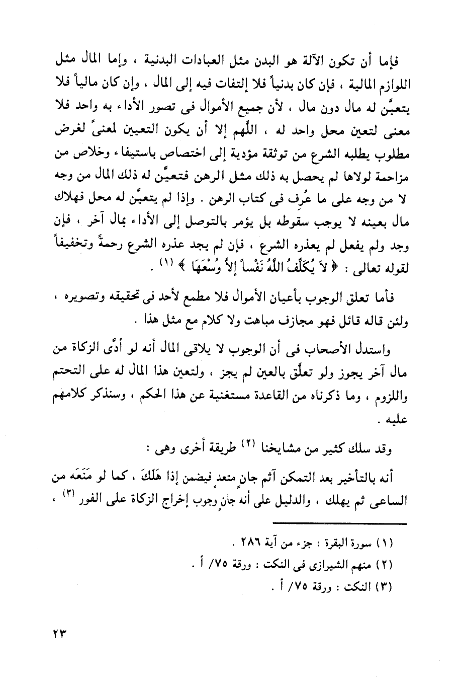 فإما أن تكون الآلة هو البدن مثل العبادات البدنية، وإما المال مثل اللوازم المالية، فإن كان بدنياً فلا التفات فيه إلى المال، وإن كان مالياً فلا يتعين له مال دون مال، لأن جميع الأموال في تصور الأداء به واحد فلا معنى لتعين محل واحد له، اللهم إلا أن يكون التعيين لمعنى لغرض مطلوب يطلبه الشرع من توثقه مؤدية إلى اختصاص باستيفاء وخلاص من مزاحمة لولاها لم يحصل به ذلك مثل الرهن فتعين له ذلك المال من وجه لا من وجه على ما عرف في كتاب الرهن. وإذا لم يتعين له محل فهلاك مال بعينه لا يوجب سقوطه بل يؤمر بالتوصل إلى الأداء بمال آخر، فإن وجد ولم يفعل لم يعذره الشرع، فإن لم يجد عذره الشرع رحمةً وتخفيفاً لقوله تعالى: {لَا يُكَلِّفُ اللَّهُ نَفْسًا إِلَّا وُسْعَهَا}.