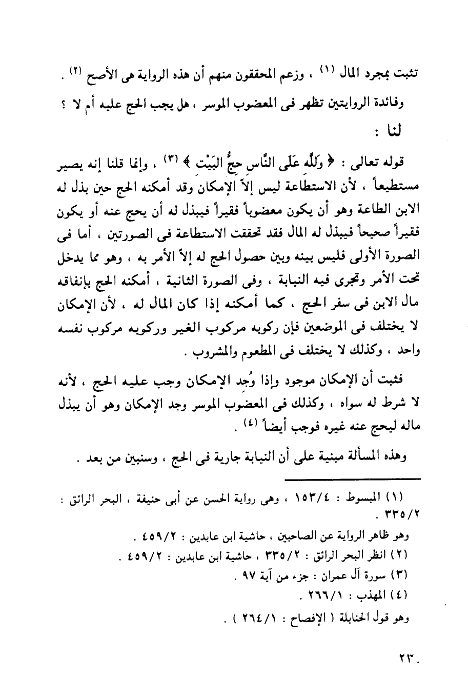 قوله تعالى: {وَلِلَّهِ عَلَى النَّاسِ حِجُّ الْبَيْتِ}، وإنما قلنا إنه يصير مستطيعاً، لأن الاستطاعة ليس إلا الإمكان وقد أمكنه الحج حين بذل له الابن الطاعة وهو أن يكون معضوباً فقيراً فيبذل له أن يحج عنه أو يكون فقيراً صحيحاً فيبذل له المال فقد تحققت الاستطاعة في الصورتين، أما في الصورة الأولى فليس بينه وبين حصول الحج له إلا الأمر به، وهو مما يدخل تحت الأمر وتجرى فيه النيابة، وفي الصورة الثانية، أمكنه الحج بإنفاقه مال الابن في سفر الحج، كما أمكنه إذا كان المال له، لأن الإمكان لا يختلف في الموضعين فإن ركوبه مركوب الغير وركوبه مركوب نفسه واحد، وكذلك لا يختلف في المطعوم والمشروب.