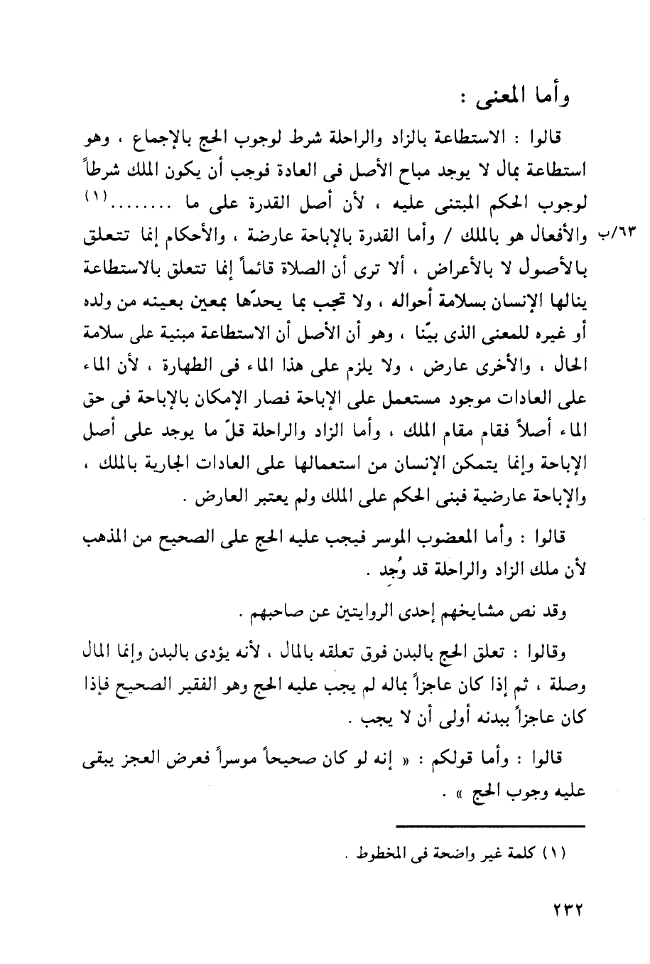 قالوا: الاستطاعة بالزاد والراحلة شرط لوجوب الحج بالإجماع، وهو استطاعة بمال لا يوجد مباح الأصل في العادة فوجب أن يكون الملك شرطاً لوجوب الحكم المبتنى عليه، لأن أصل القدرة على ما ......... والأفعال هو بالملك/ وأما القدرة بالإباحة عارضة، والأحكام إنما تتعلق بالأصول لا بالأعراض، ألا ترى أن الصلاة قائماً إنما تتعلق بالاستطاعة ينالها الإنسان بسلامة أحواله، ولا تحجب بما يحدها بمعين بعينه من ولده أو غيره للمعنى الذي بينا، وهو أن الأصل أن الاستطاعة مبنية على سلامة الحال، والأخرى عارض، ولا يلزم على هذا الماء في الطهارة، لأن الماء على العادات موجود مستعمل على الإباحة فصار الإمكان بالإباحة في حق الماء أصلاً فقام مقام الملك، وأما الزاد والراحلة قل ما يوجد على أصل الإباحة وإنما يتمكن الإنسان من استعمالها على العادات الجارية بالملك، والإباحة عارضية فبني الحكم على الملك ولم يعتبر العارض.