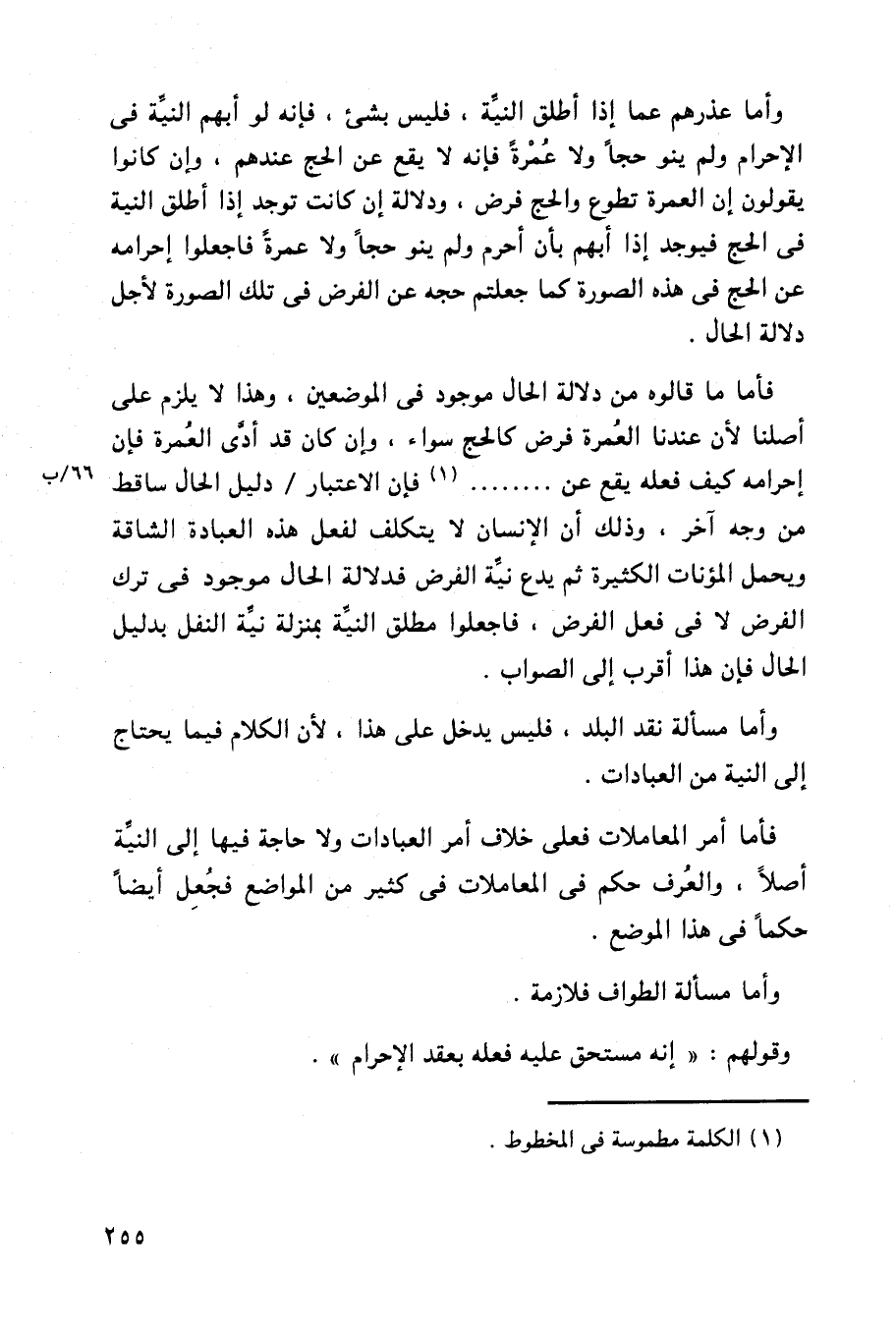 فأما ما قالوه من دلالة الحال موجود في الموضعين، وهذا لا يلزم على أصلنا لأن عندنا العمرة فرض كالحج سواء، وإن كان قد أدى العمرة فإن إحرامه كيف فعله يقع عن ....... فإن الاعتبار/ دليل الحال ساقط من وجه آخر، وذلك أن الإنسان لا يتكلف لفعل هذه العبادة الشاقة ويحمل المؤنات الكثيرة ثم يدع نية الفرض فدلالة الحال موجود في ترك الفرض لا في فعل الفرض، فاجعلوا مطلق النية بمنزلة نية النفل بدليل الحال فإن هذا أقرب إلى الصواب.